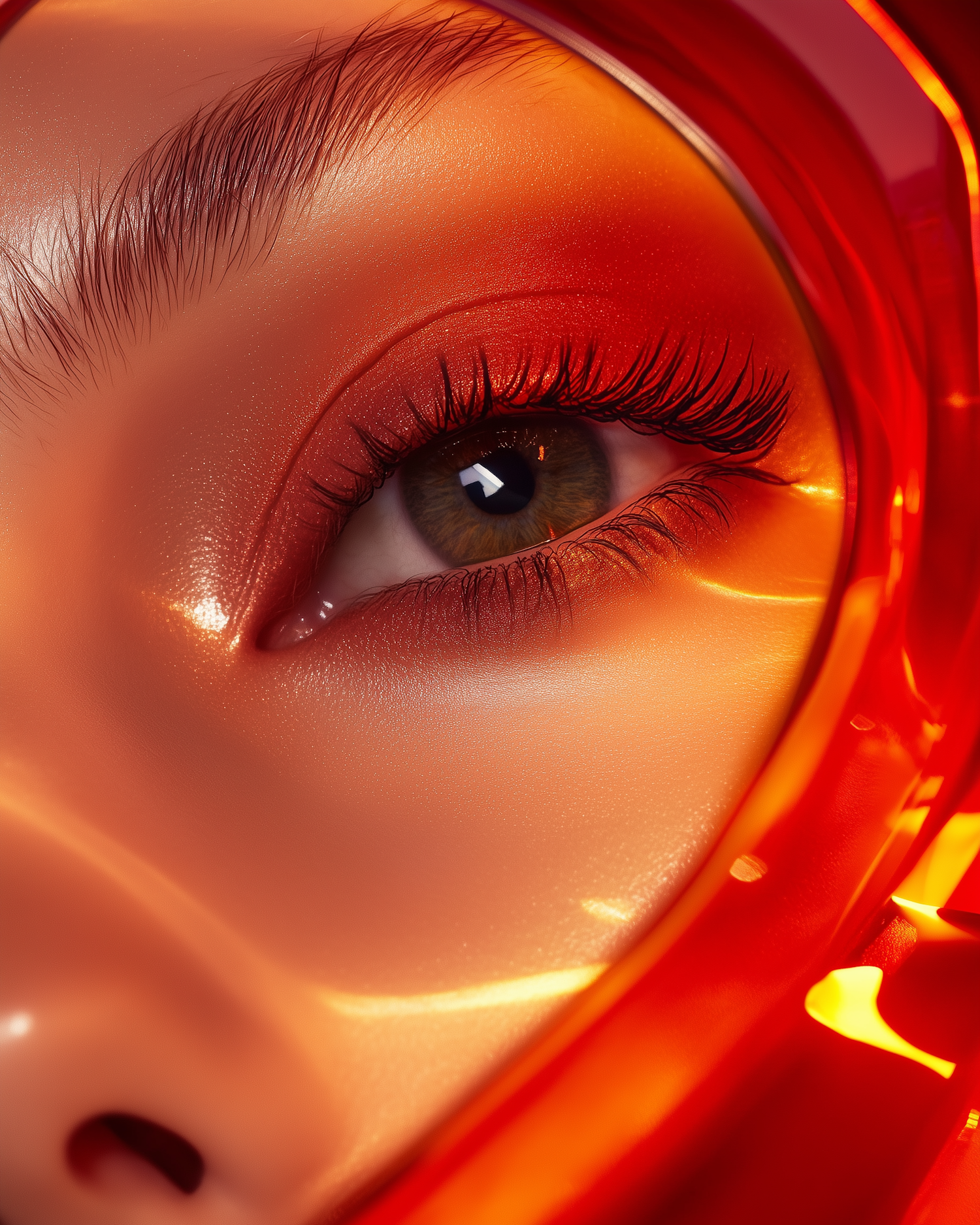 Close-up of a brown eye with vibrant orange and red hues, highlighting long lashes and smooth skin. Artistic and dramatic lighting.