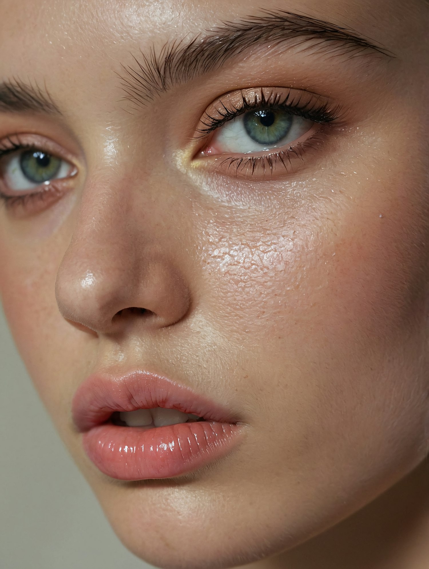 Close-up of a young woman with green eyes, glossy lips, and dewy skin, showcasing natural beauty and captivating gaze.