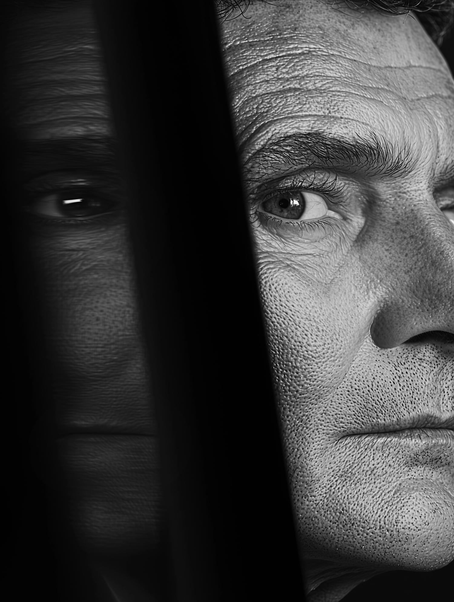 Intense black and white close-up of a man's face with a reflective surface, highlighting texture and expression.