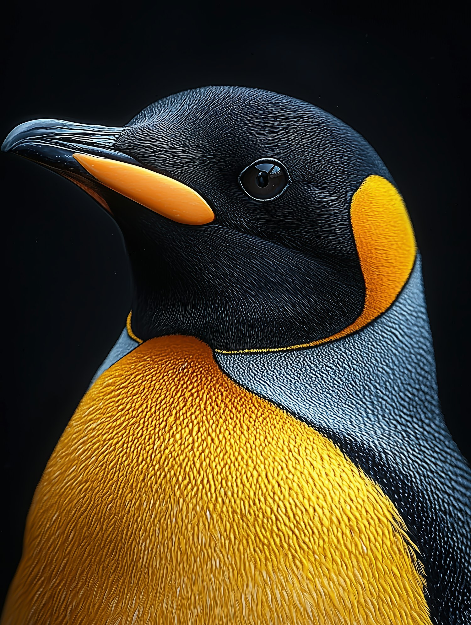 Close-up of a king penguin with vibrant yellow and orange markings against a black background.