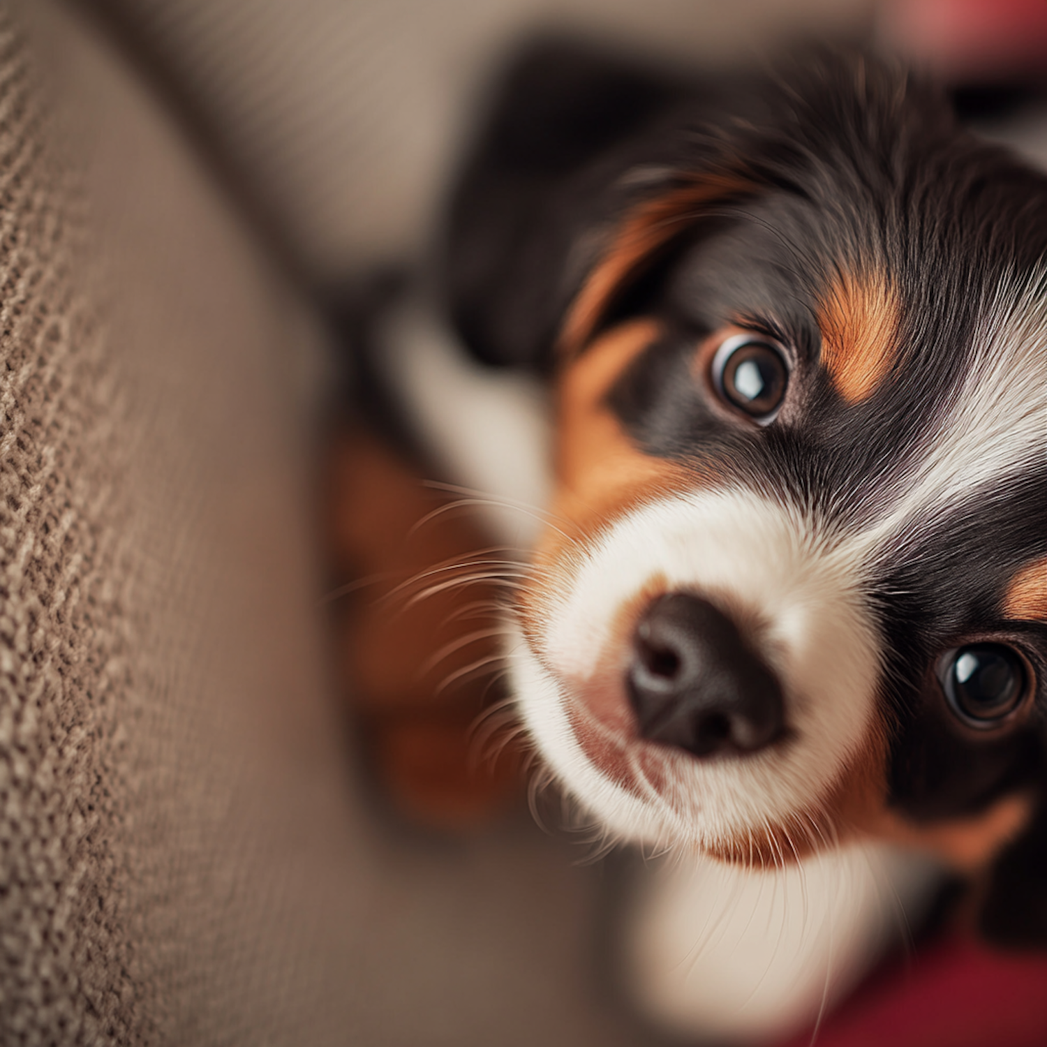 Adorable close-up of a tricolor puppy with expressive eyes and a fluffy coat, set against a cozy, blurred background.