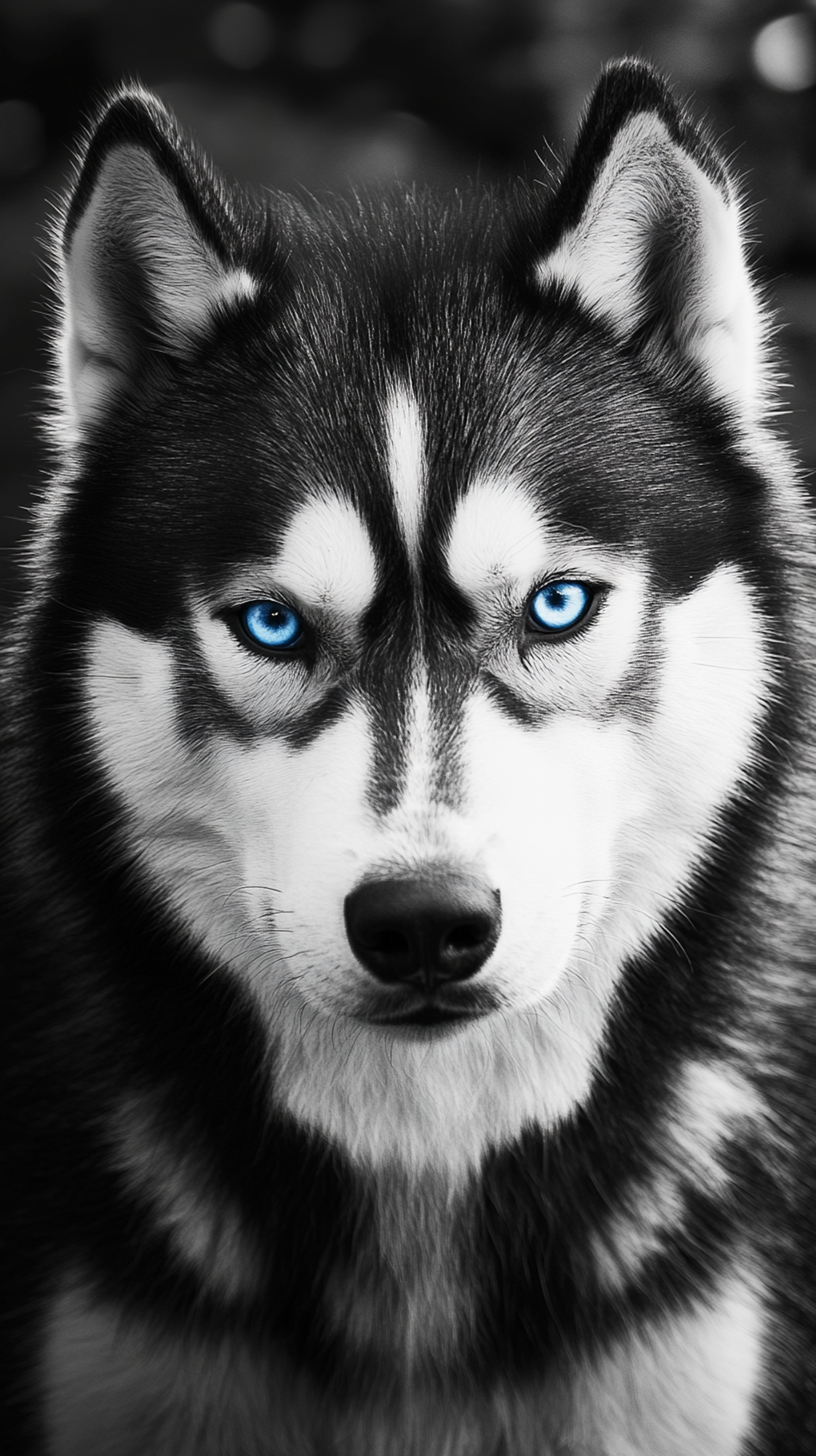 Close-up of a Siberian Husky with vivid blue eyes and monochrome fur, showcasing its striking features and intense gaze.