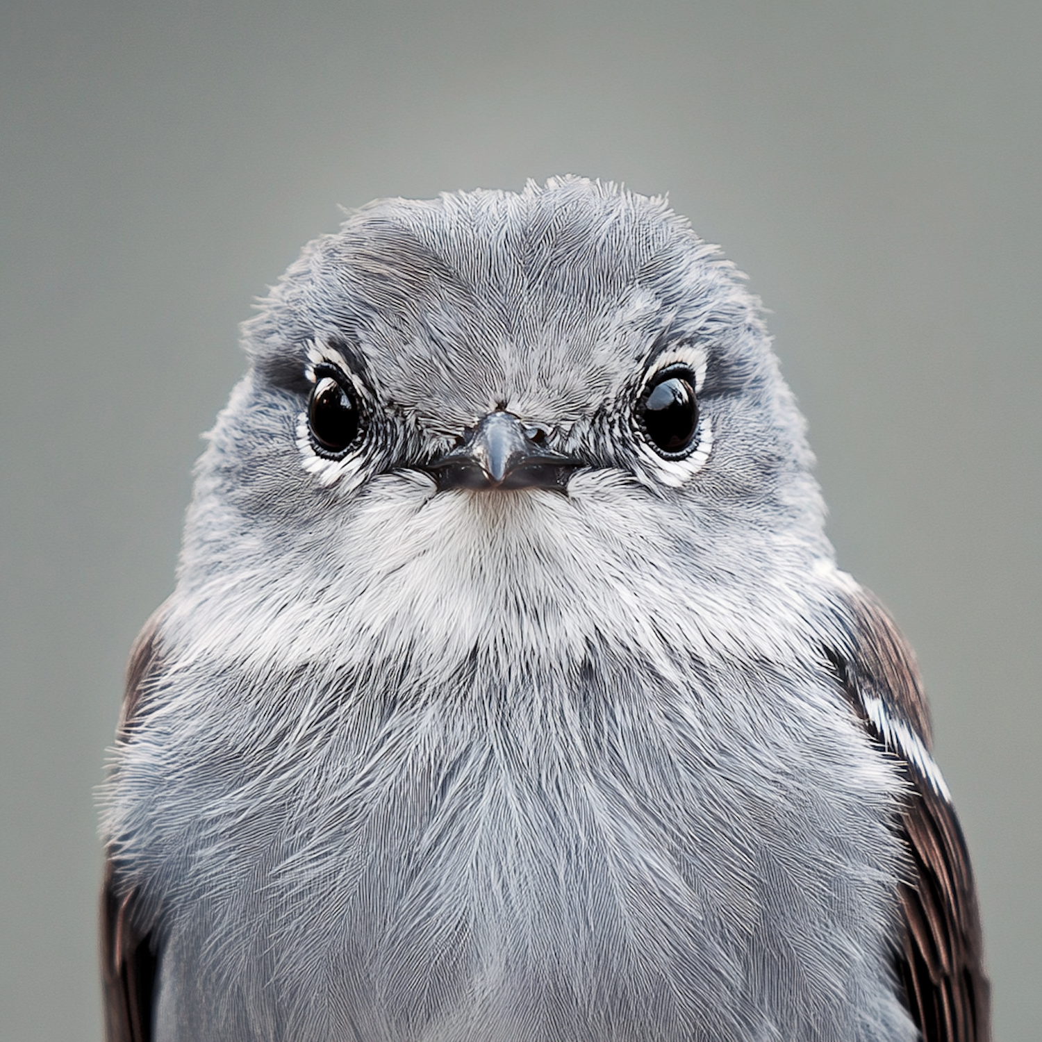 Close-up of a small gray bird with fluffy feathers and striking black eyes against a muted gray background.