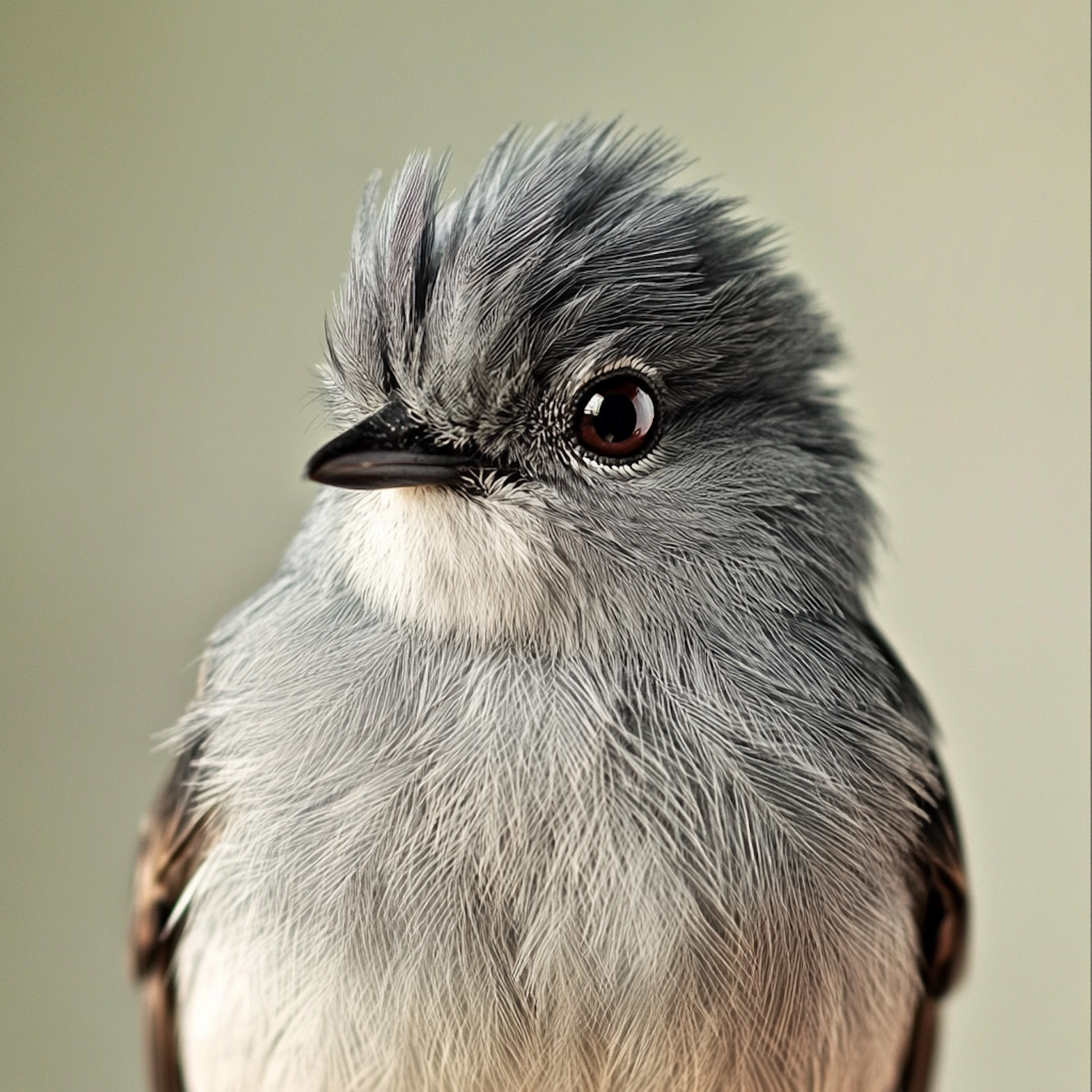 Close-up of a small gray bird with fluffy feathers and expressive eyes against a soft green background.