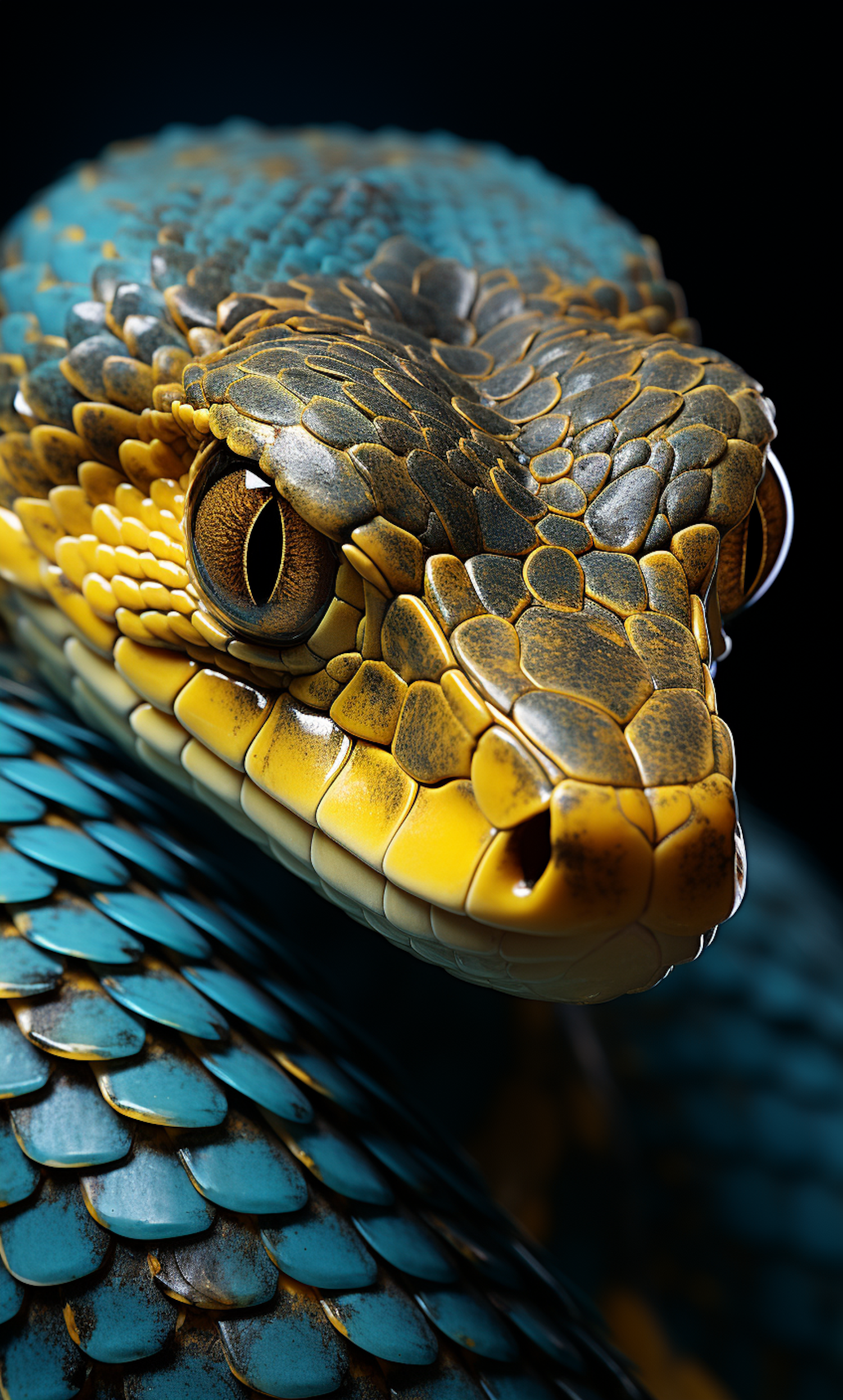Close-up of a snake with vibrant teal and yellow scales, showcasing its intricate pattern and intense gaze against a dark background.