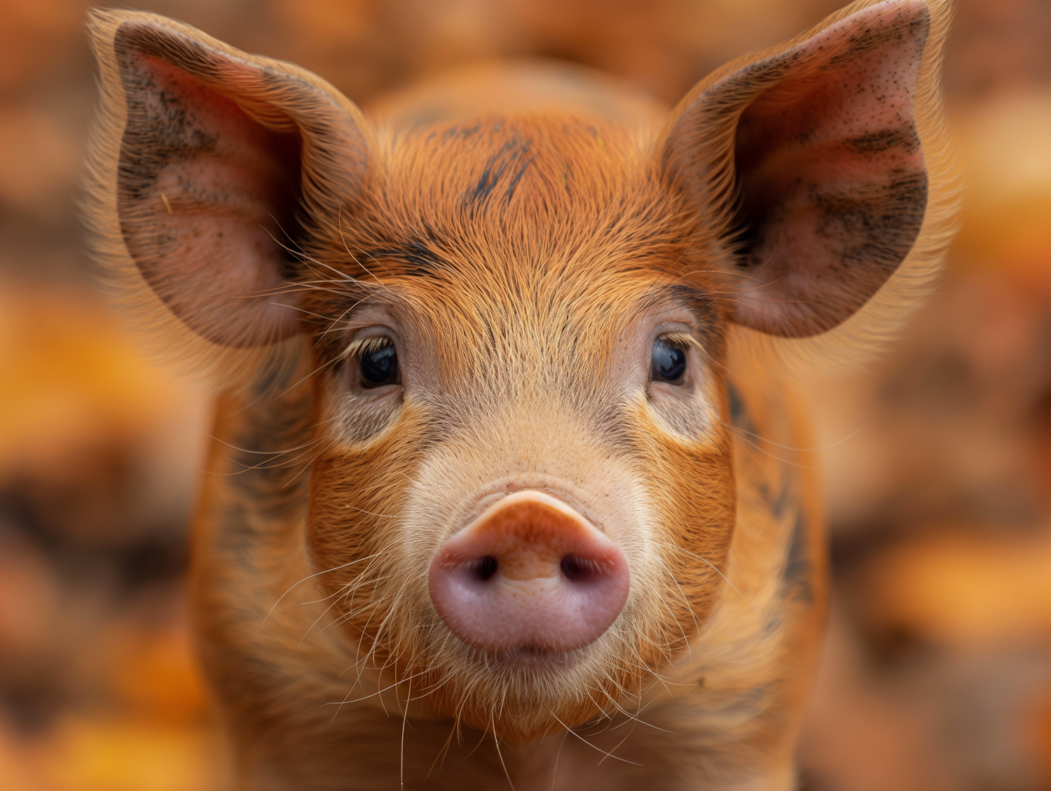 Adorable close-up of a piglet with a spotted coat and warm autumn background, showcasing its cute features and curious expression.