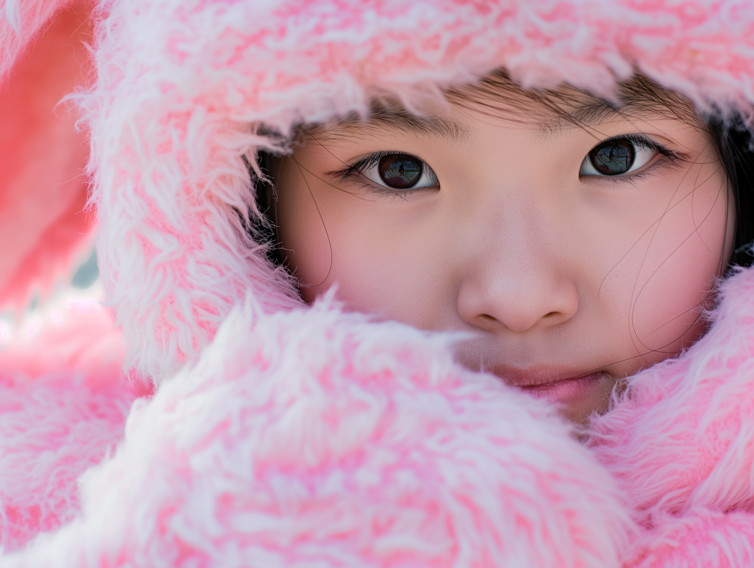 Close-up of fluffy pink fabric, possibly a costume or plush toy, with a blurred face in the background.