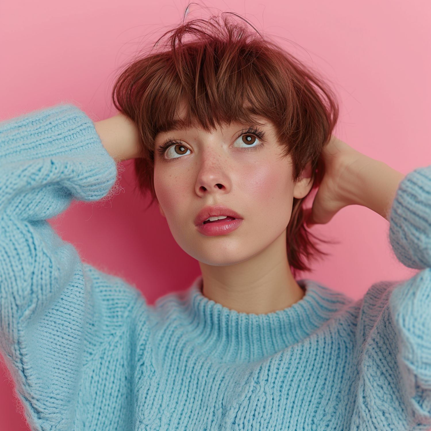 Young woman in a blue sweater against a pink background, gazing upward with a thoughtful expression.