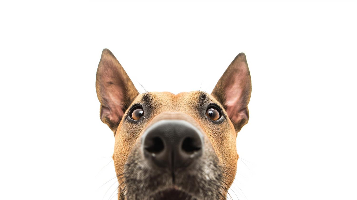 Close-up of a curious dog with perked ears, large eyes, and a prominent nose against a clean white background.
