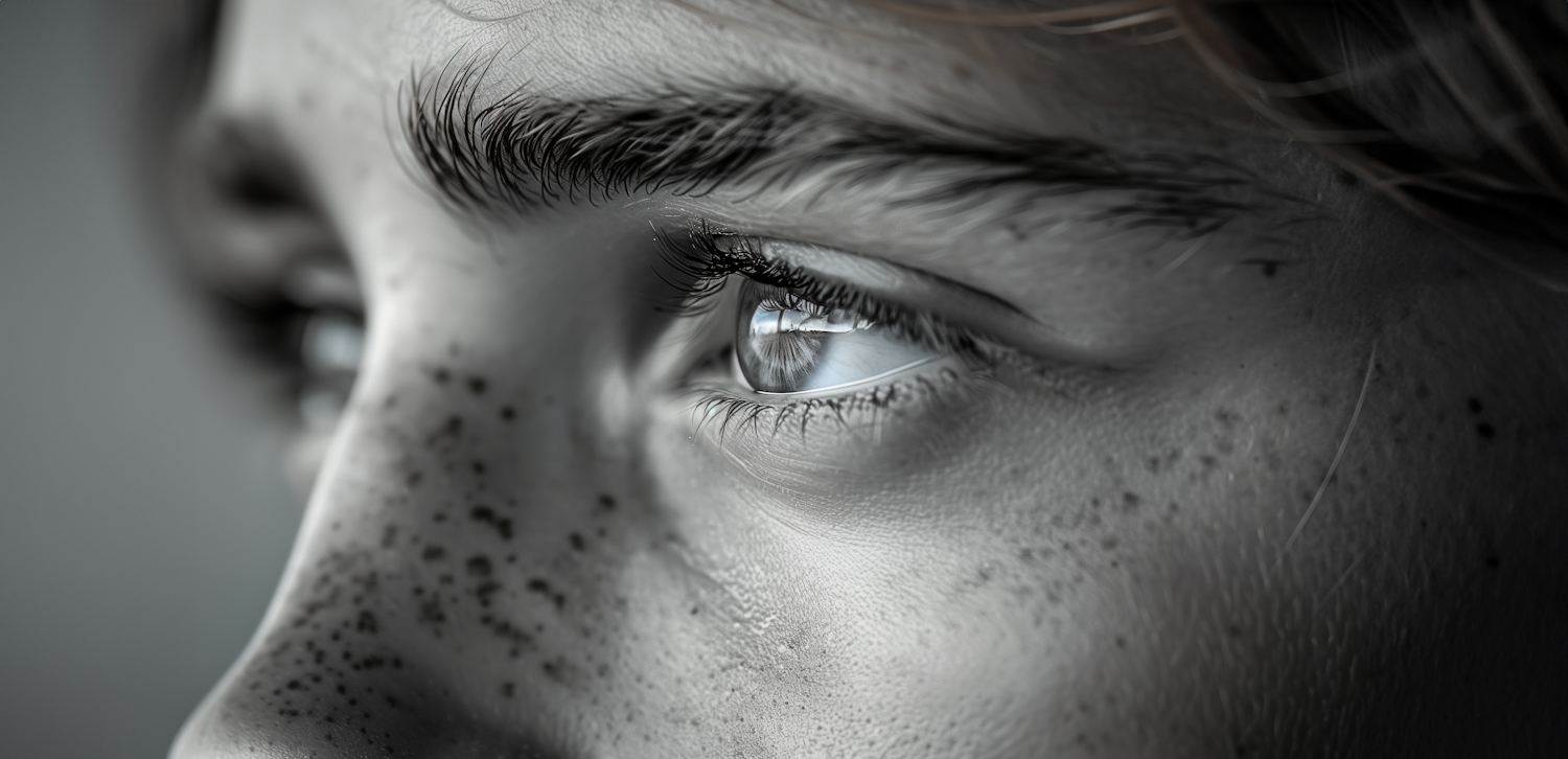 Close-up of a freckled face with a detailed, reflective eye and textured skin in a monochromatic palette.