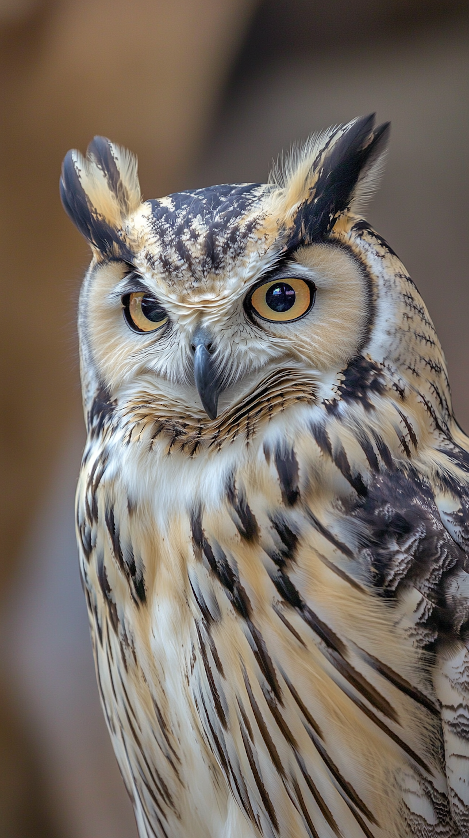 Close-up of a majestic owl with piercing yellow-orange eyes, intricate feather patterns, and prominent ear tufts in soft lighting.