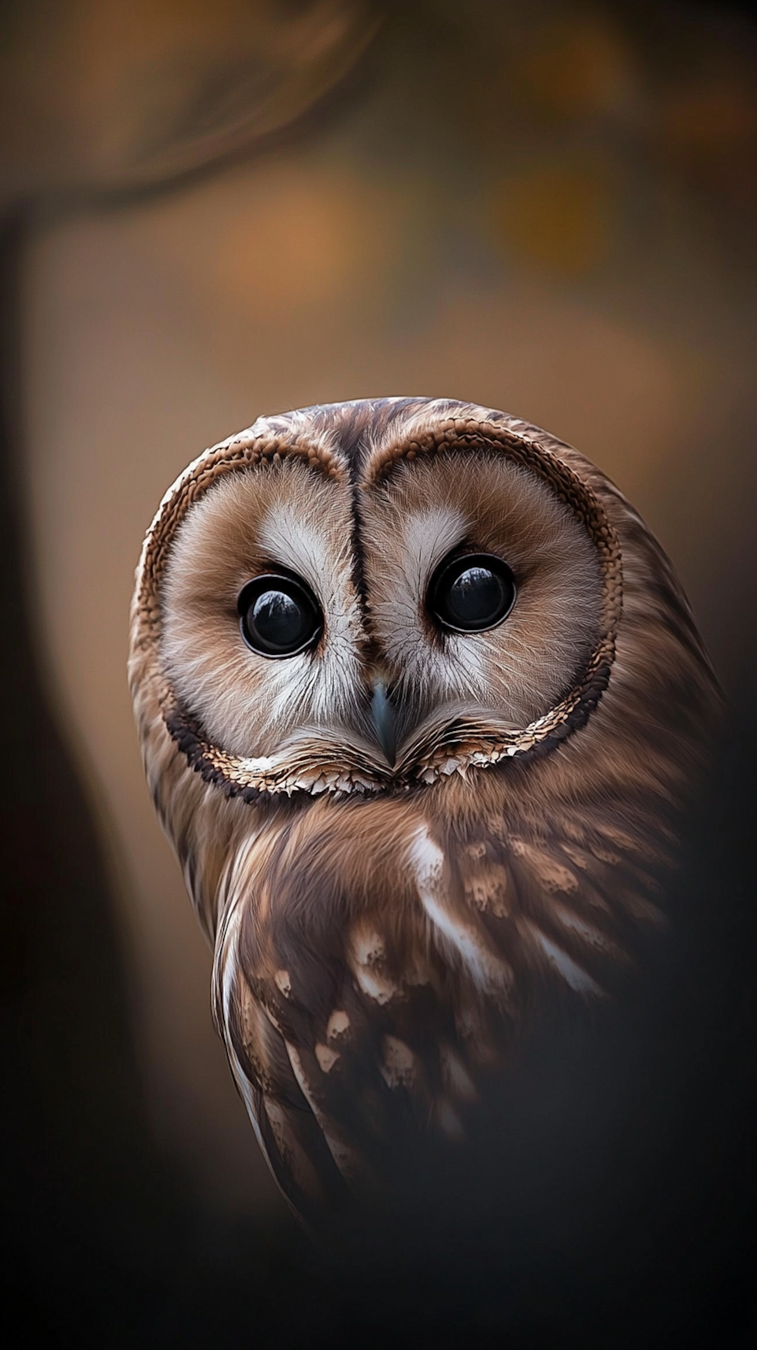 Close-up of an owl with large dark eyes and intricate feather patterns, set against a softly blurred background.