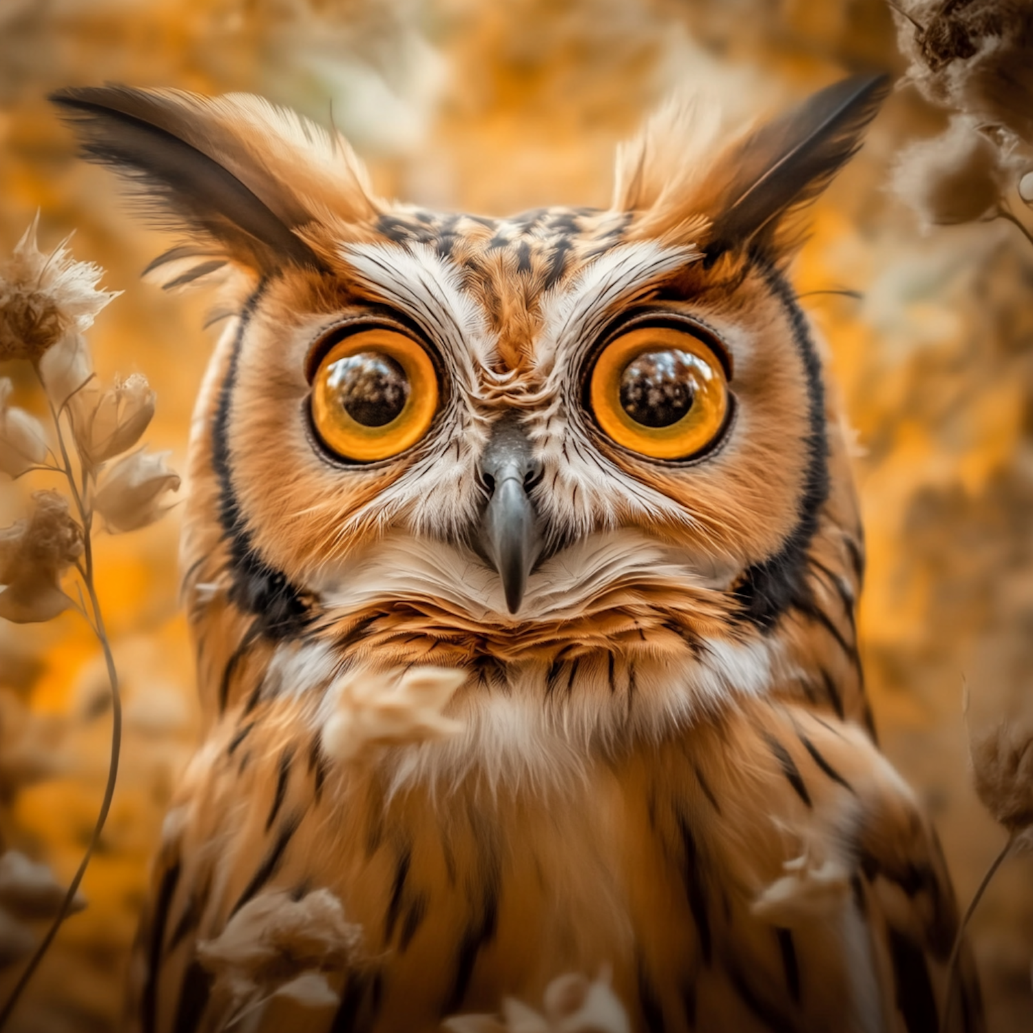 Close-up of an owl with large yellow eyes and intricate feather patterns, set against a warm, blurred golden background.