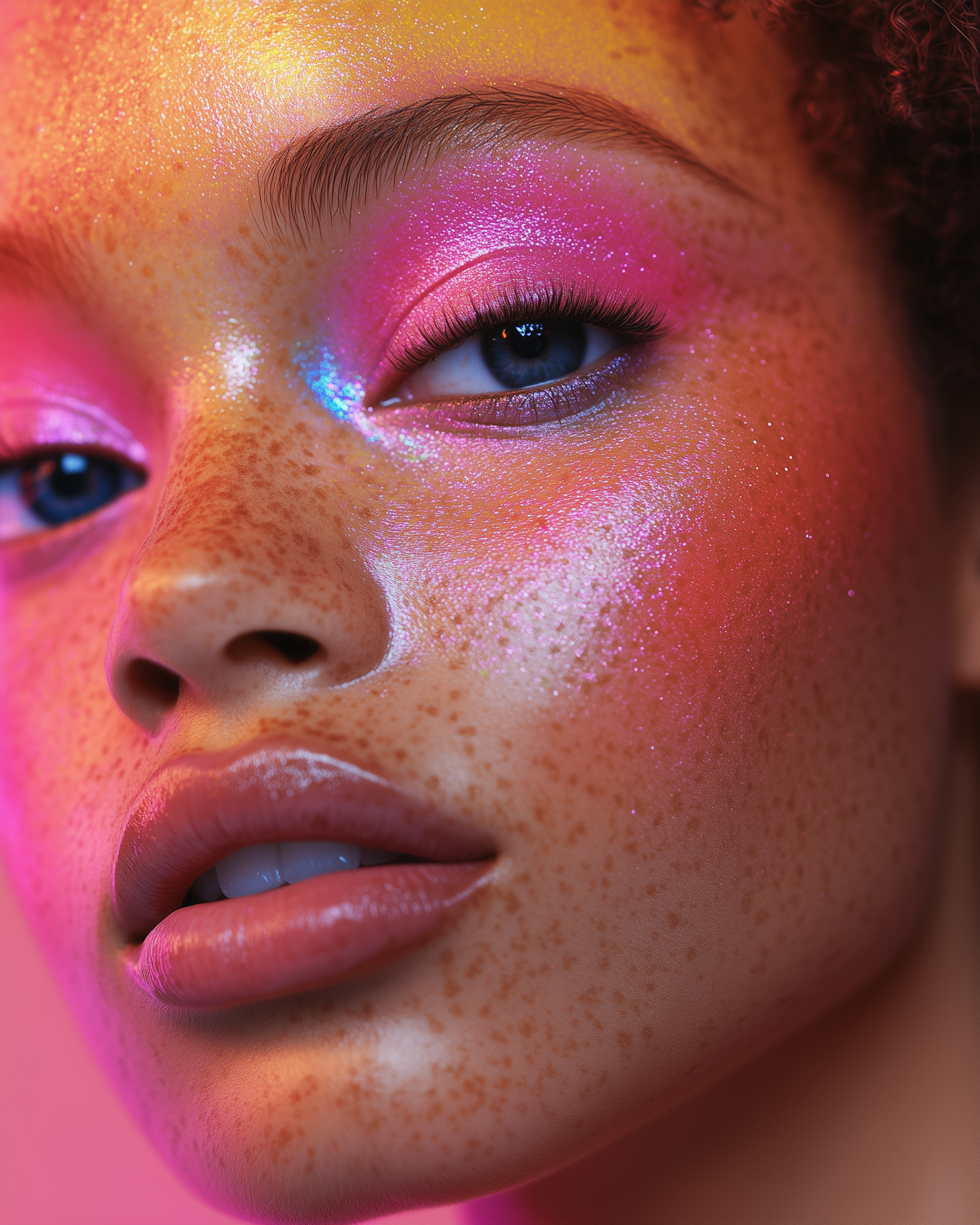 Close-up of a woman with freckles, vibrant pink makeup, and glossy lips, highlighting her blue eye and artistic look.