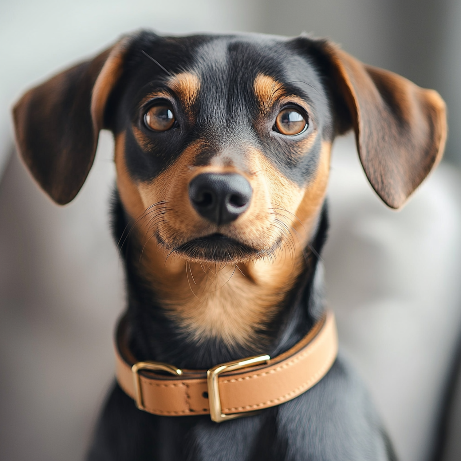 Adorable black and tan dog with expressive eyes and a leather collar, gazing curiously at the camera.