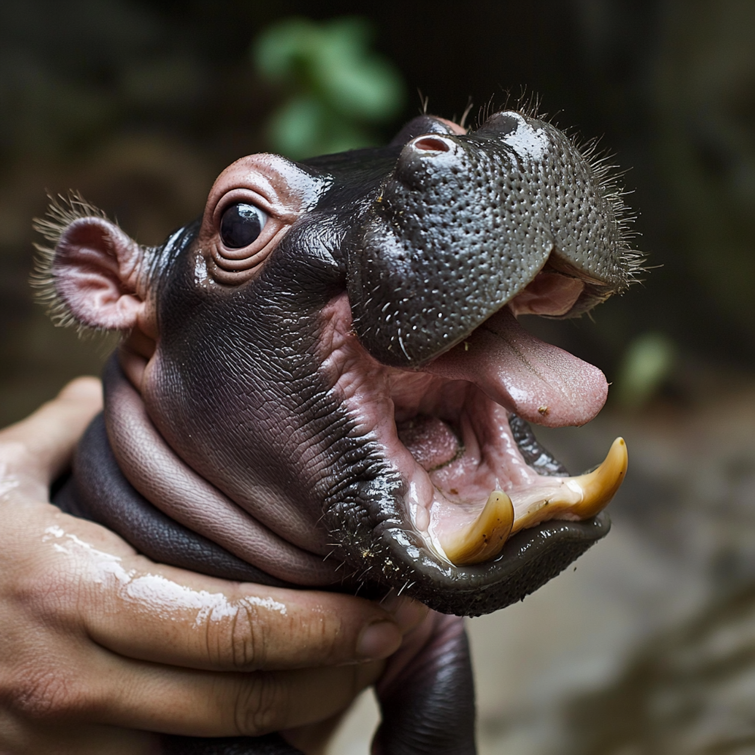 Adorable baby hippo with open mouth held gently by a human hand, showcasing its small tusks and expressive eyes.