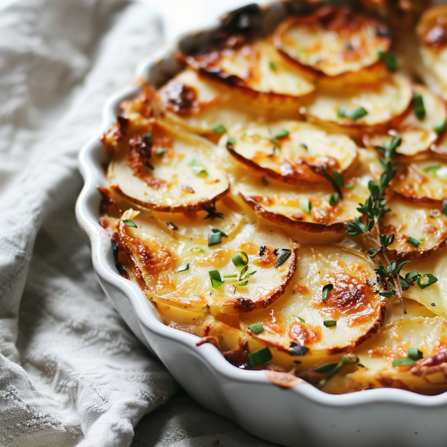 Golden brown potato gratin with fresh herbs in a white dish, showcasing a crispy top and creamy layers.