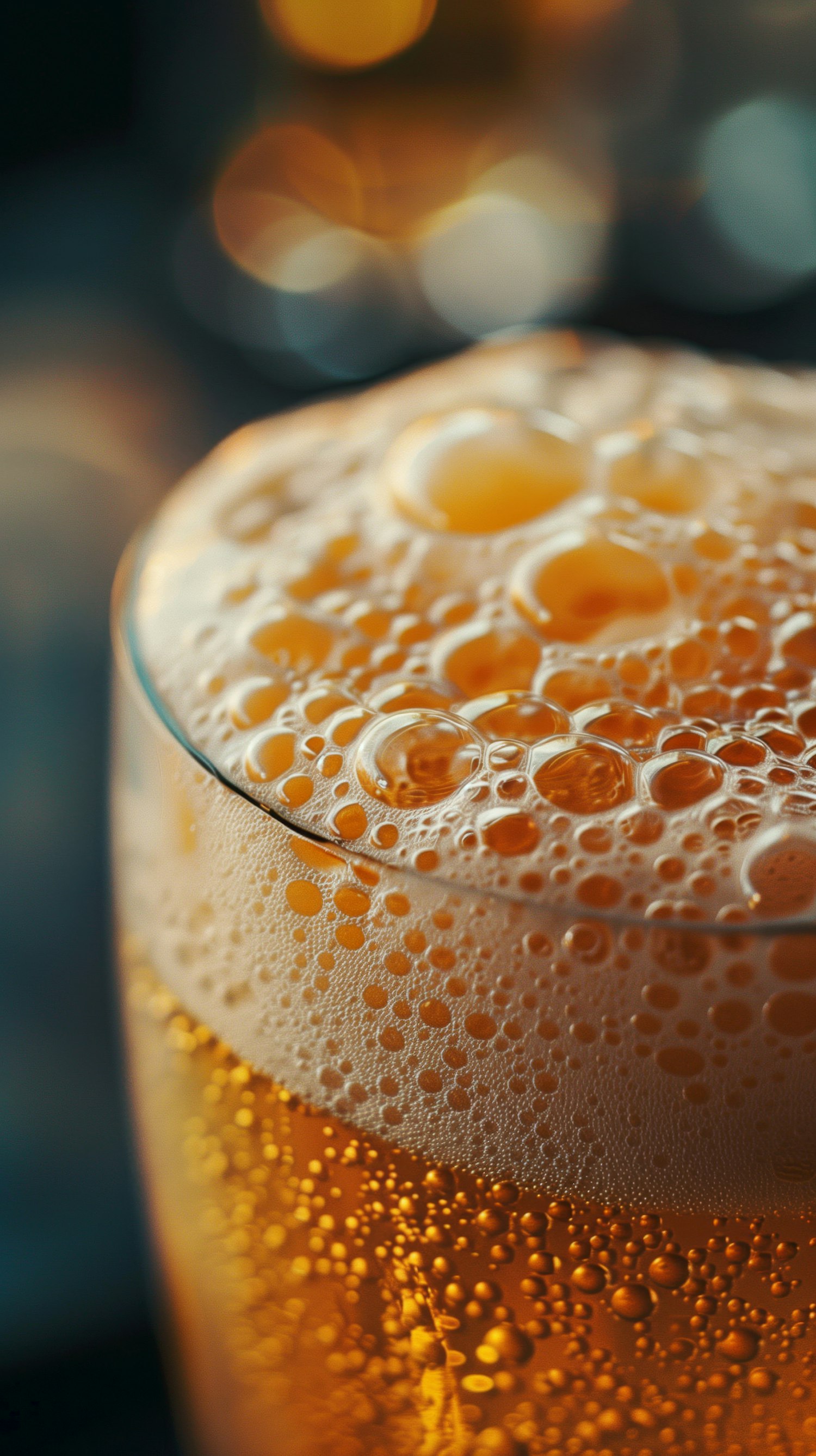 Close-up of a frothy beer glass with vibrant bubbles and warm lighting, creating a refreshing and inviting scene.
