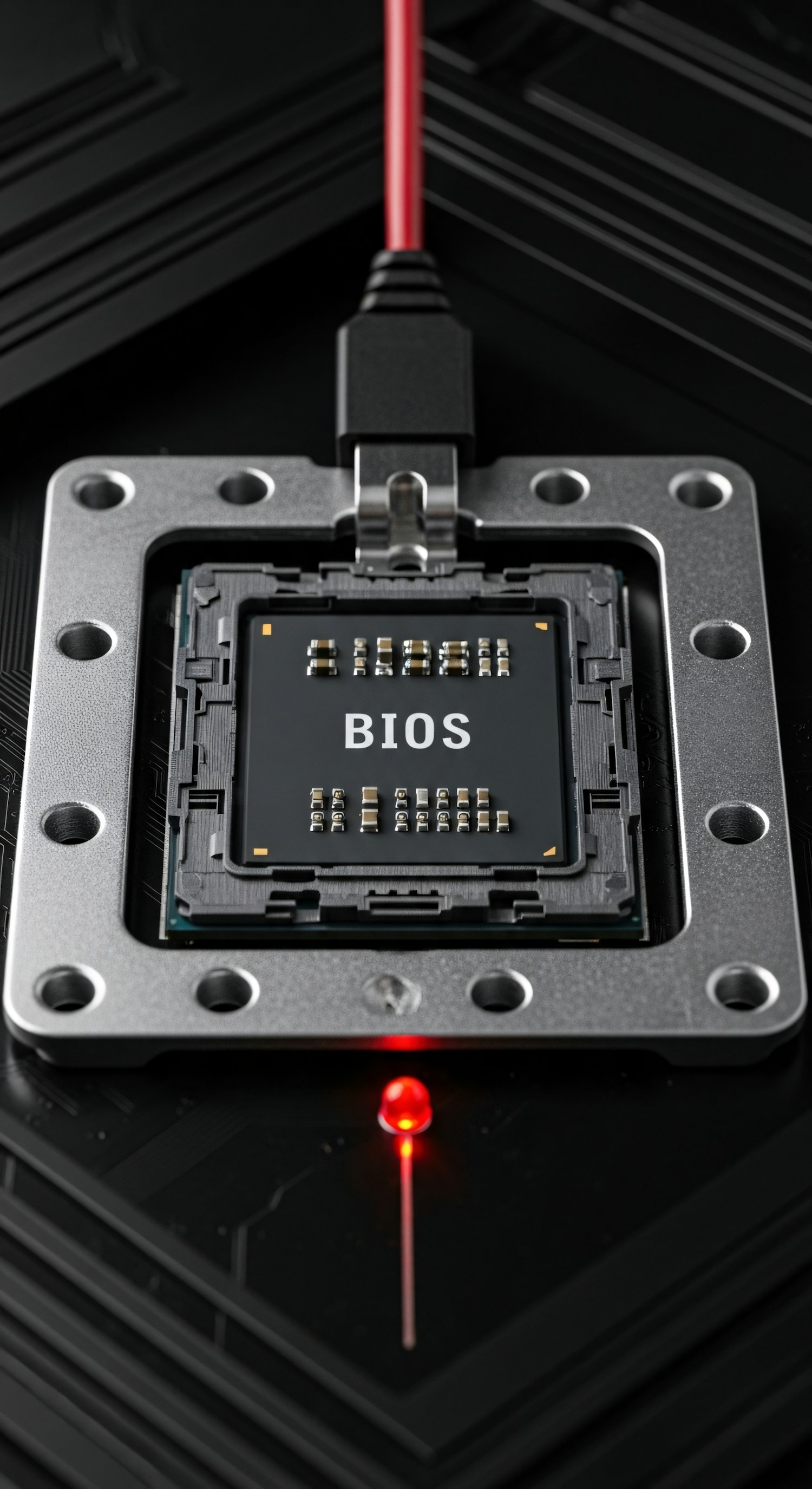 Close-up of a BIOS chip on a motherboard with a red LED light and metallic frame, showcasing intricate tech details.