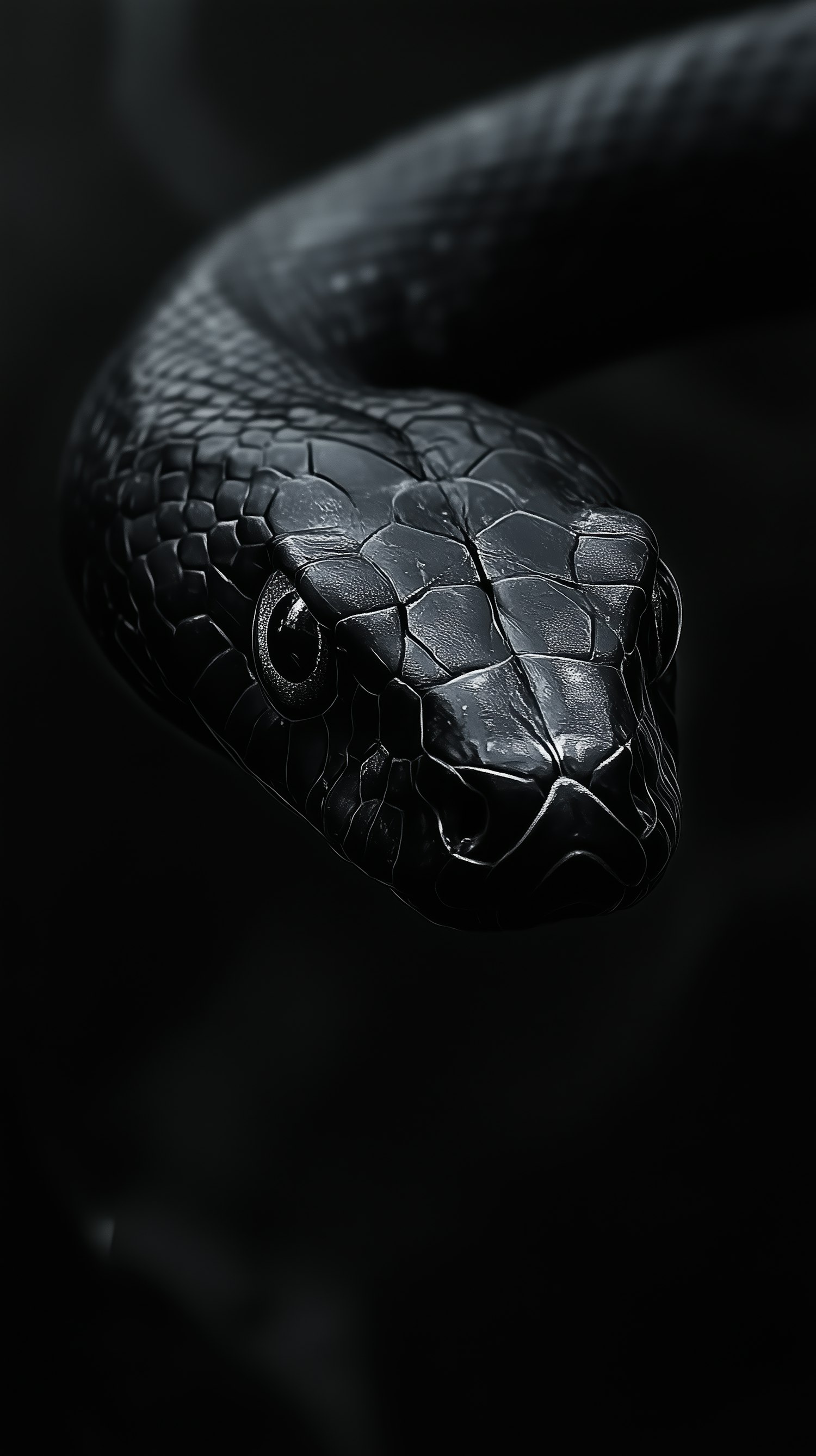 Close-up of a black snake with glossy scales and intense gaze, set against a dark background, highlighting its sleek texture.