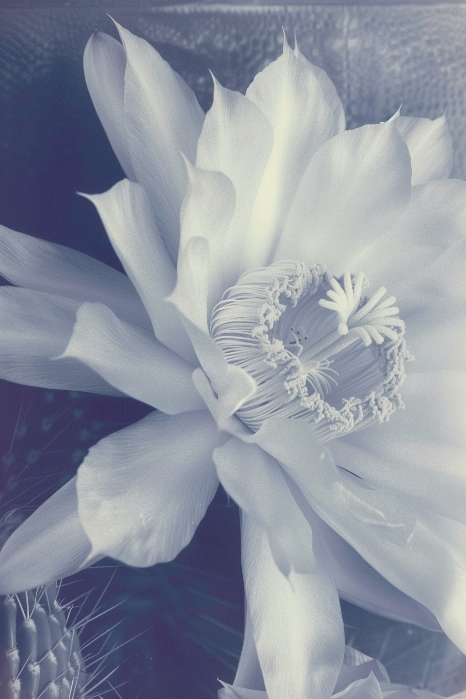 Close-up of a blooming cactus flower with delicate white petals and intricate center, set against a blurred background.