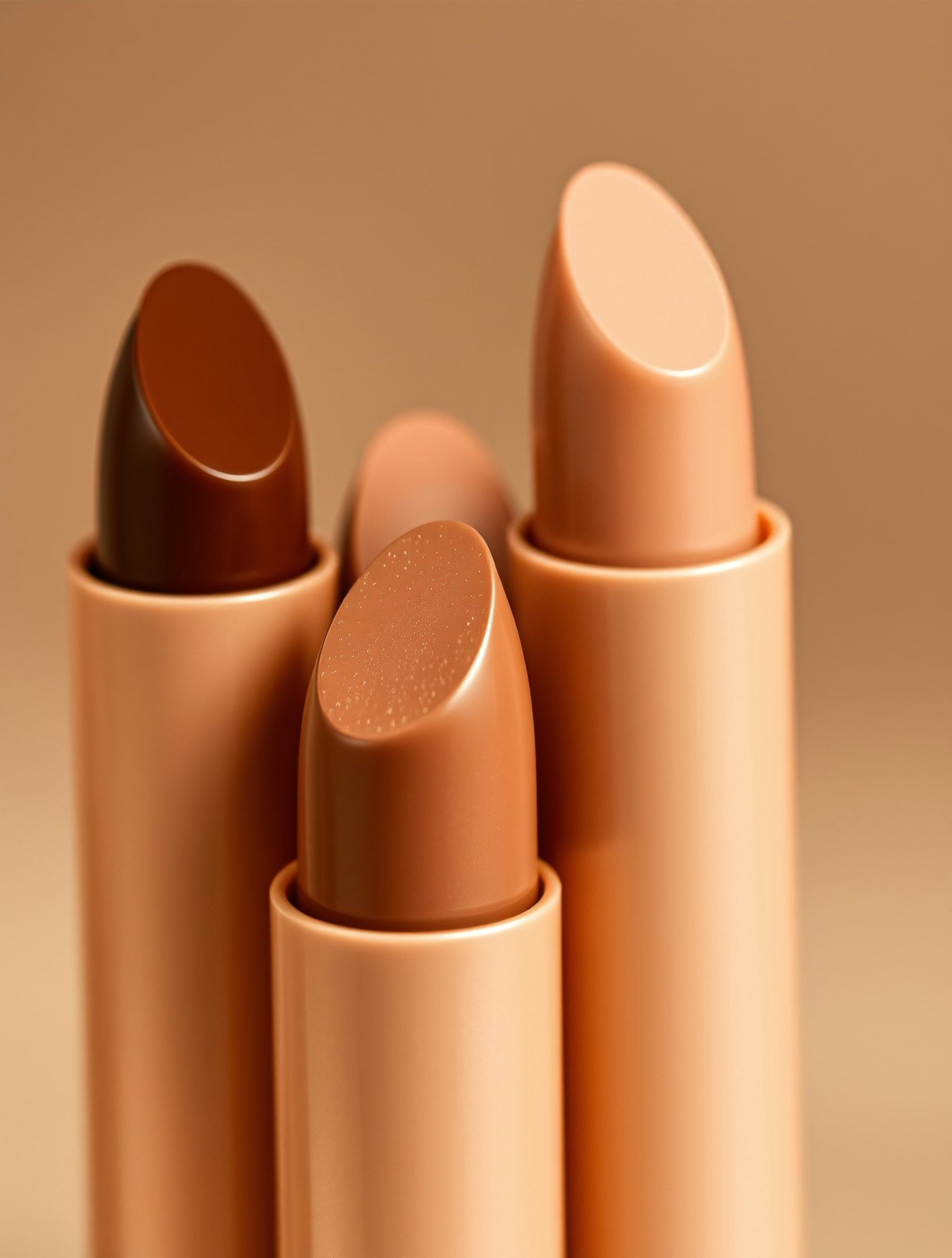 Close-up of four lipsticks in shades of brown and nude, showcasing their smooth, creamy texture against a warm beige background.
