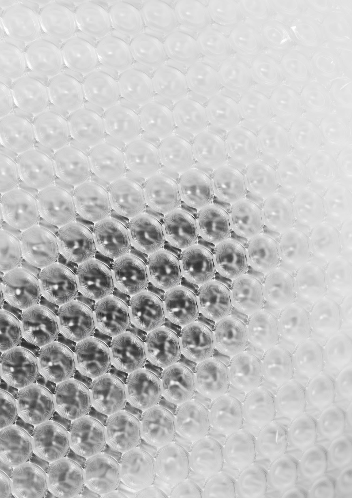 Close-up of bubble wrap with translucent air-filled pockets, creating a textured and reflective surface.