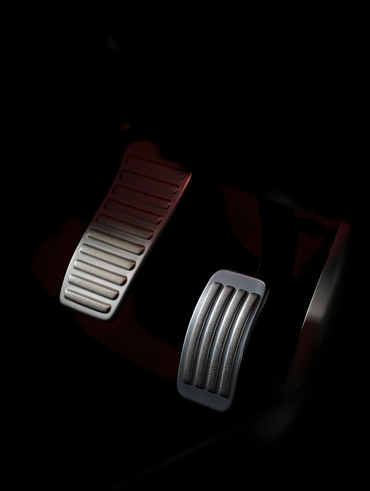 Close-up of car brake and accelerator pedals with a sleek metallic finish, illuminated against a dark background.
