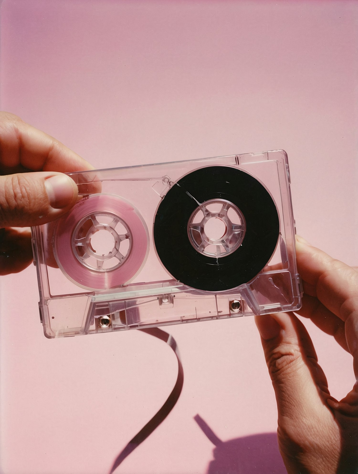 Transparent cassette tape with pink and black reels held by hands against a pink background, evoking retro nostalgia.