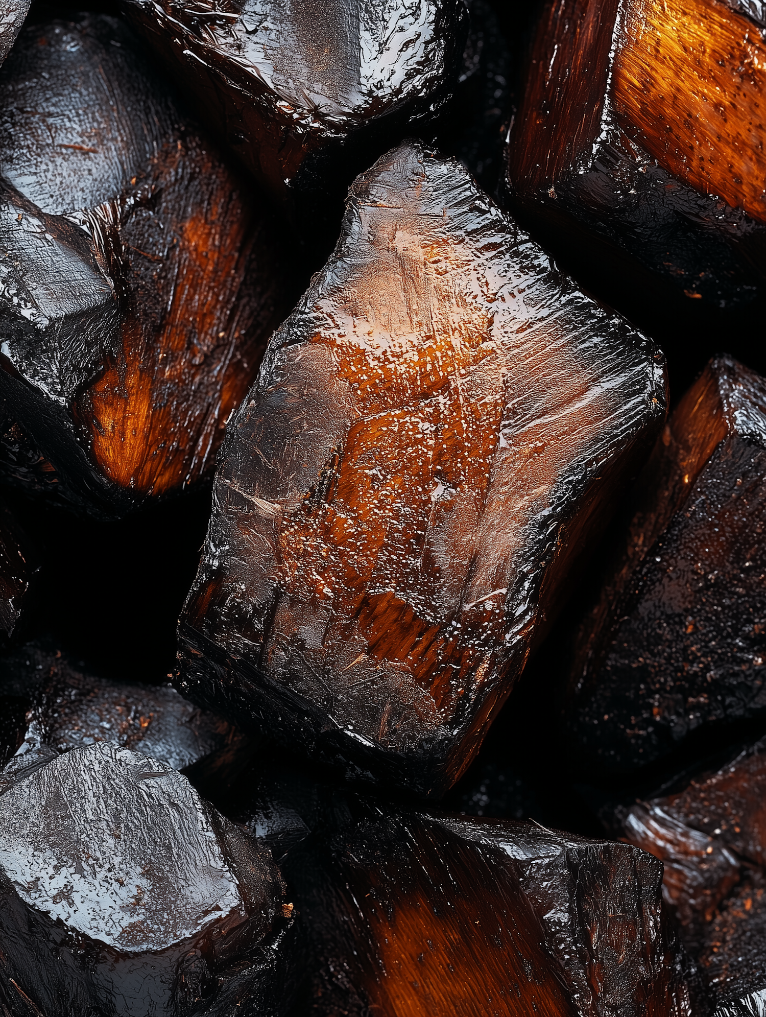 Close-up of charred wood pieces with glossy black and brown textures, highlighting intricate patterns and grains.