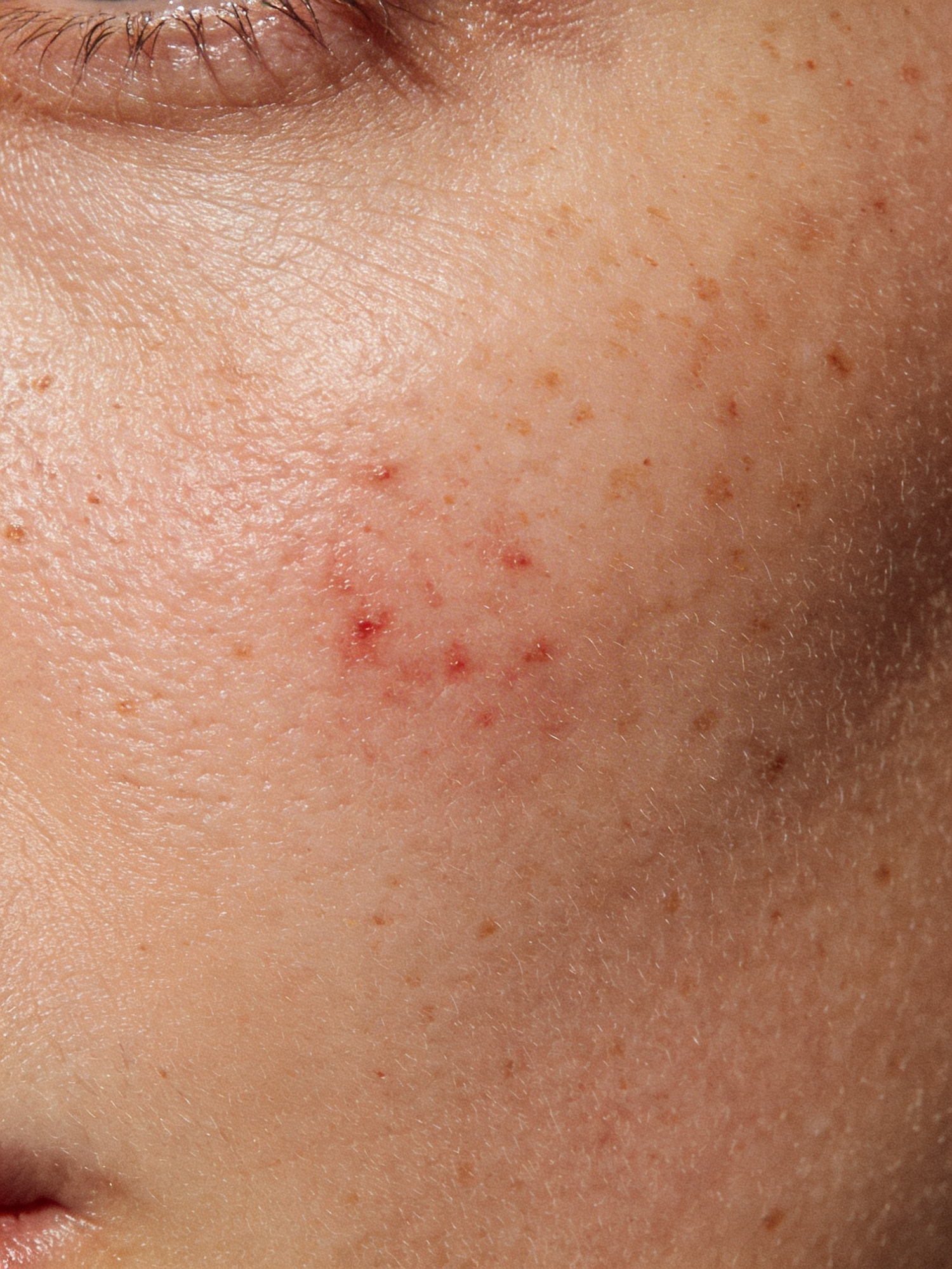 Close-up of a cheek with natural skin texture, freckles, and small blemishes, highlighting the skin's details and complexion.