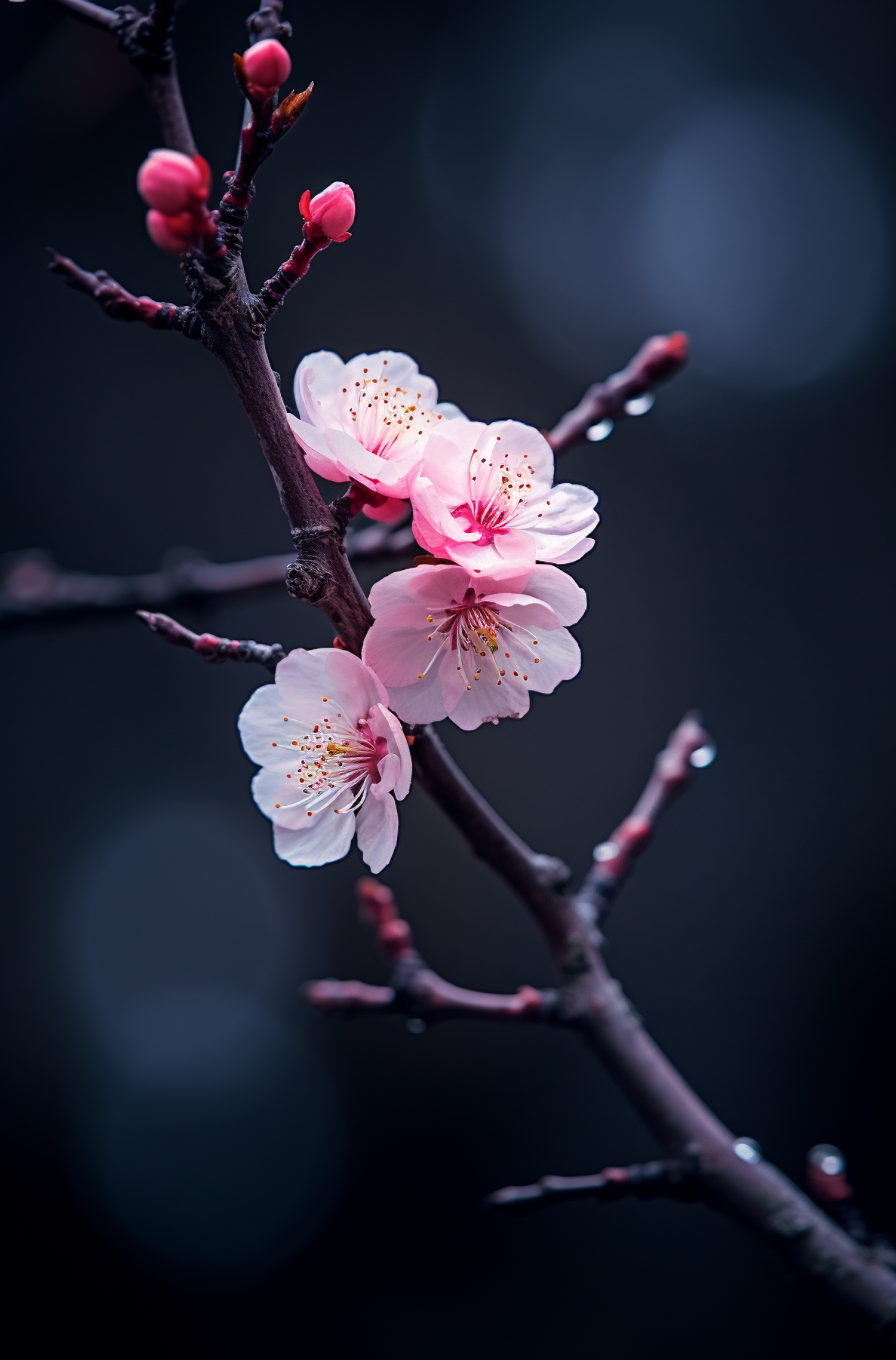 Exquisite cherry blossoms in full bloom on a dark branch, with dewy petals and vibrant pink hues against a blurred background.