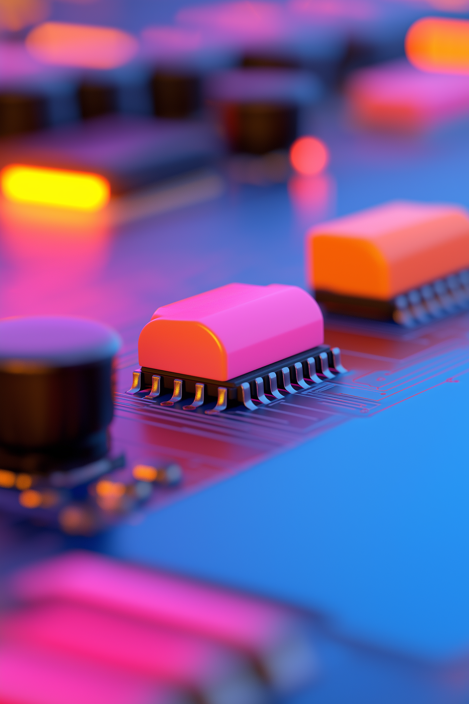 Vibrant close-up of a colorful electronic circuit board with pink and orange components, creating a futuristic tech vibe.