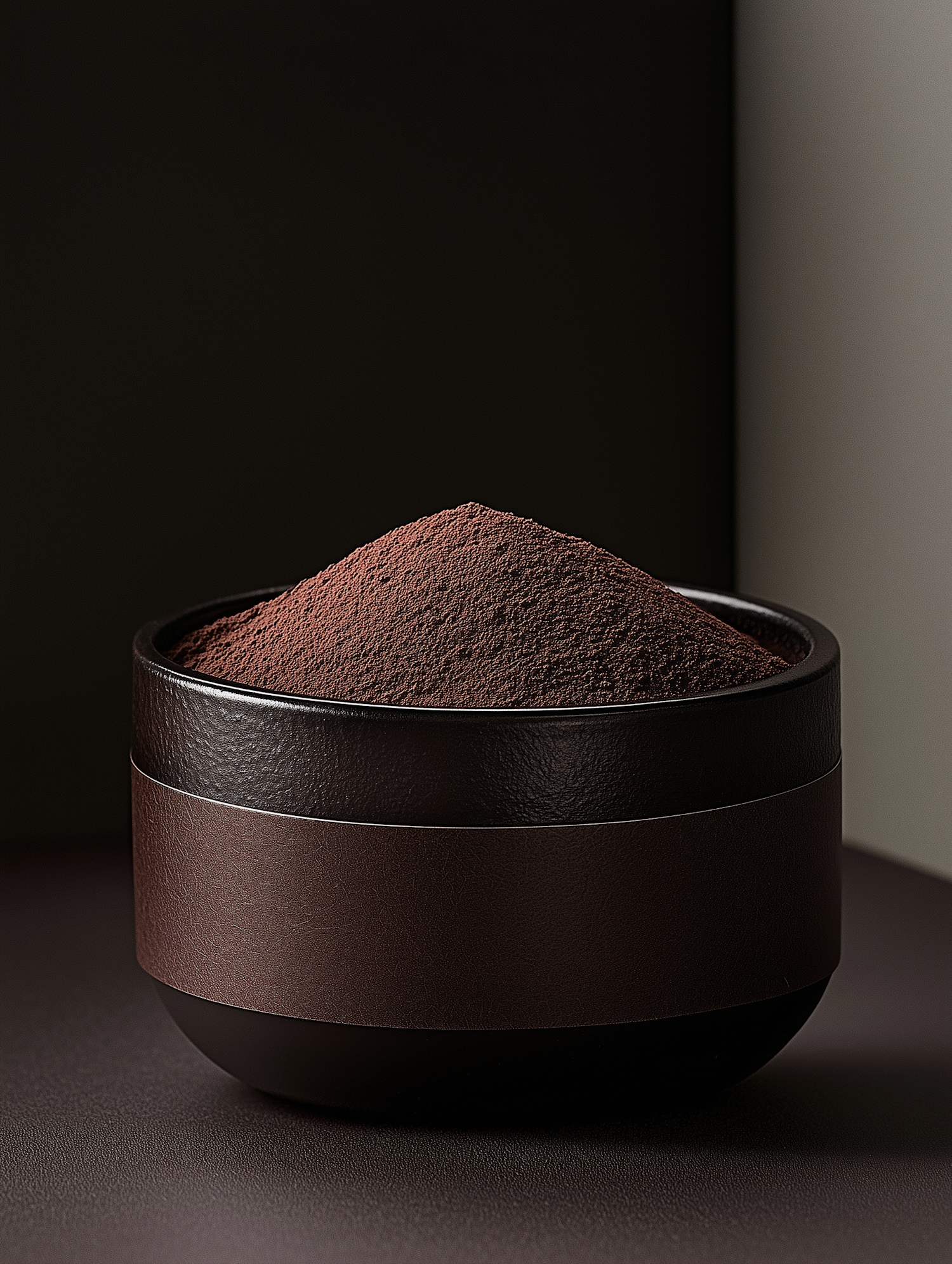 Elegant bowl filled with rich, dark cocoa powder against a minimalist dark background.