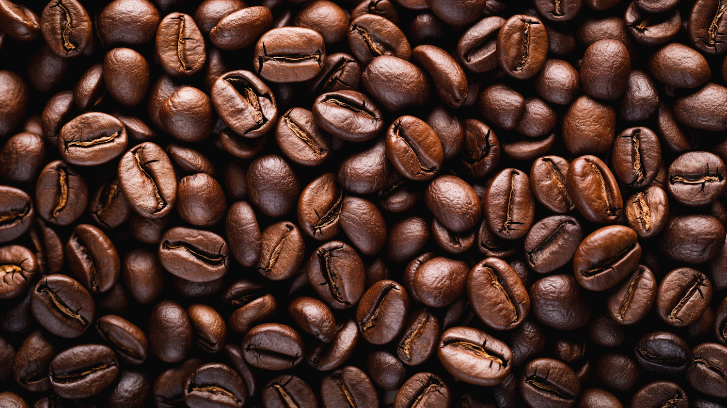Close-up of roasted coffee beans with rich brown hues and glossy texture, highlighting their smooth, oval shapes and central grooves.