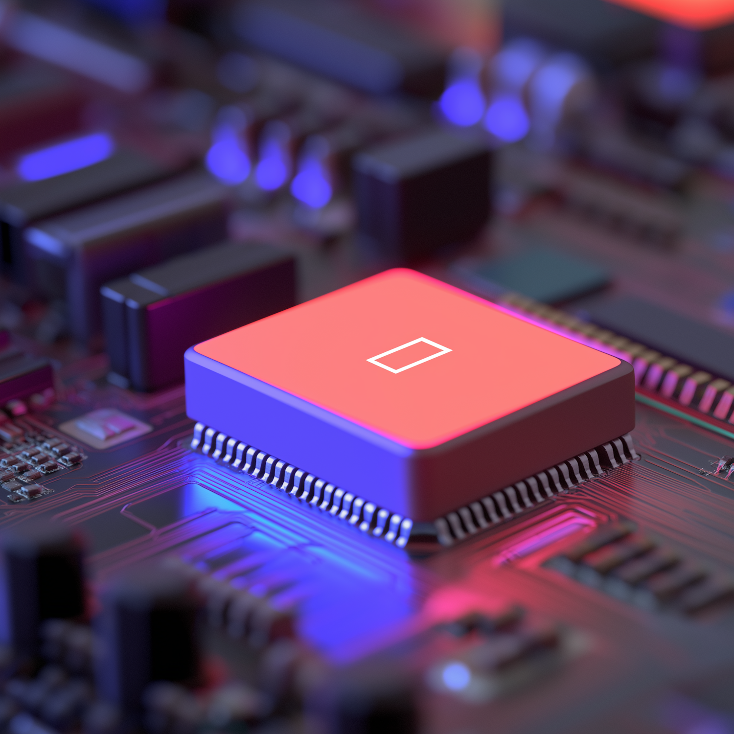 Close-up of a glowing red microchip on a circuit board with blue and purple lighting, creating a futuristic tech vibe.
