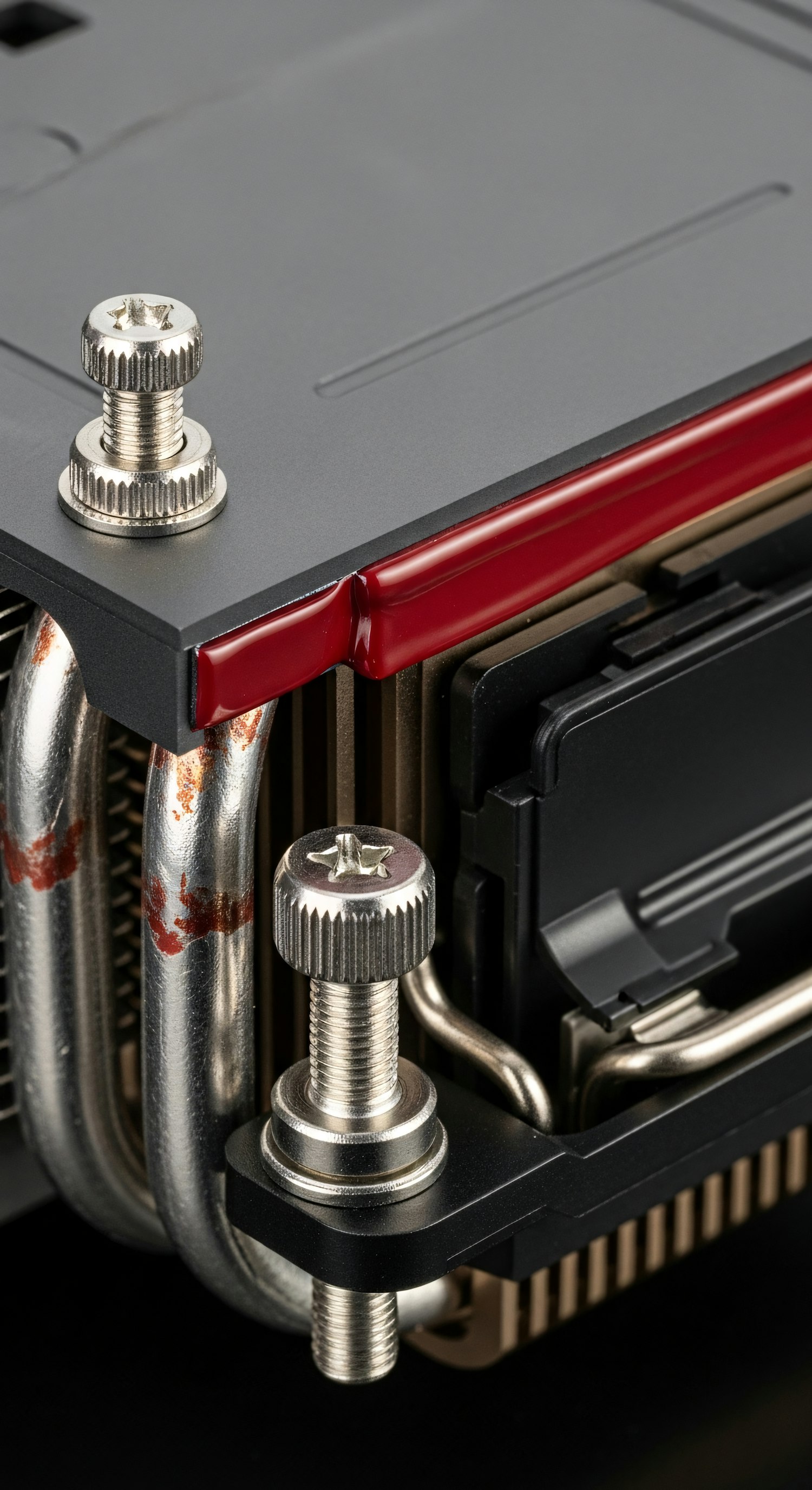 Close-up of a computer cooler with metallic heat pipes, screws, and a red accent, showcasing its detailed engineering and design.