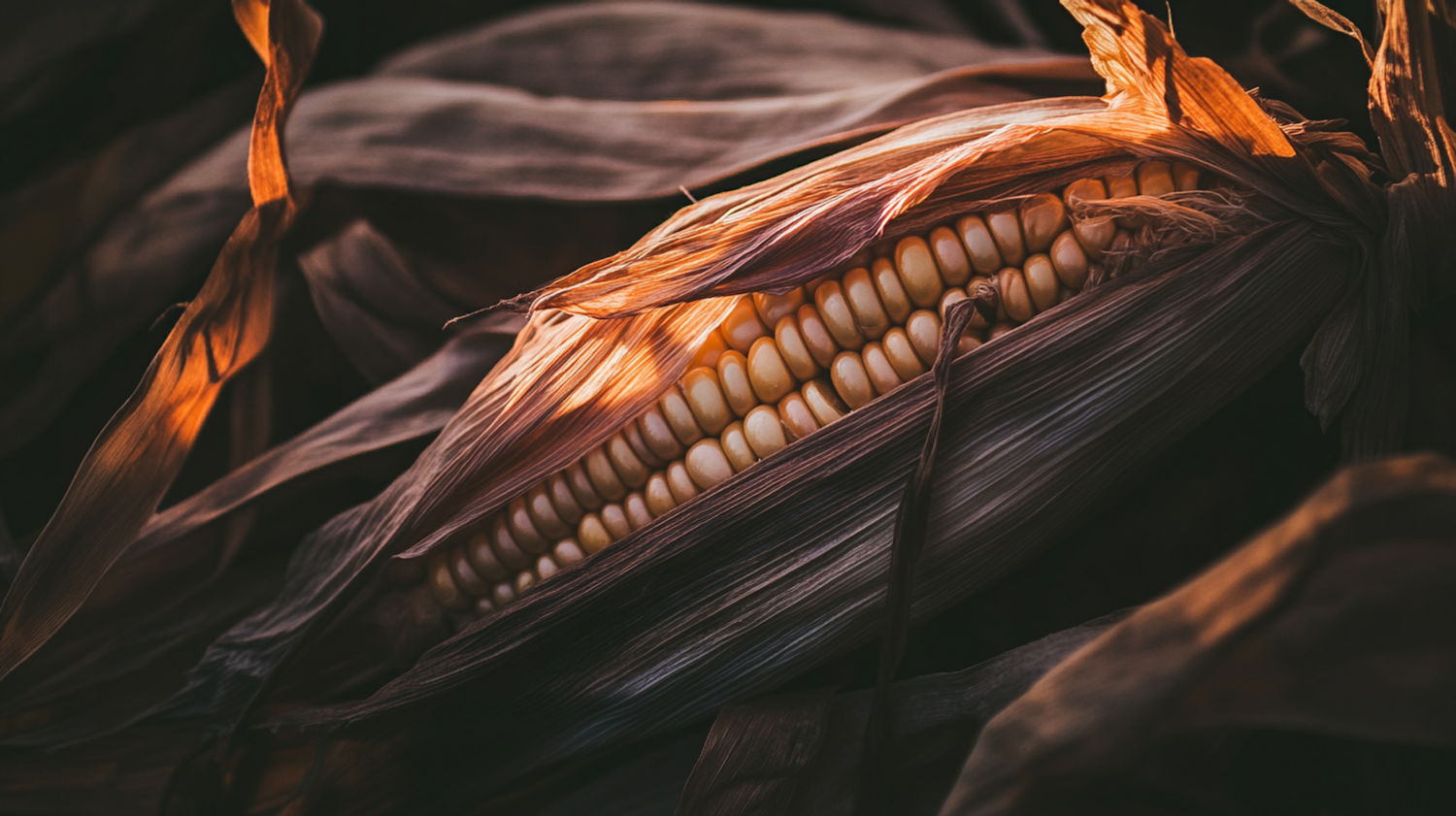 Close-up of a golden ear of corn with brown husk, highlighted by warm sunlight, showcasing natural textures and colors.