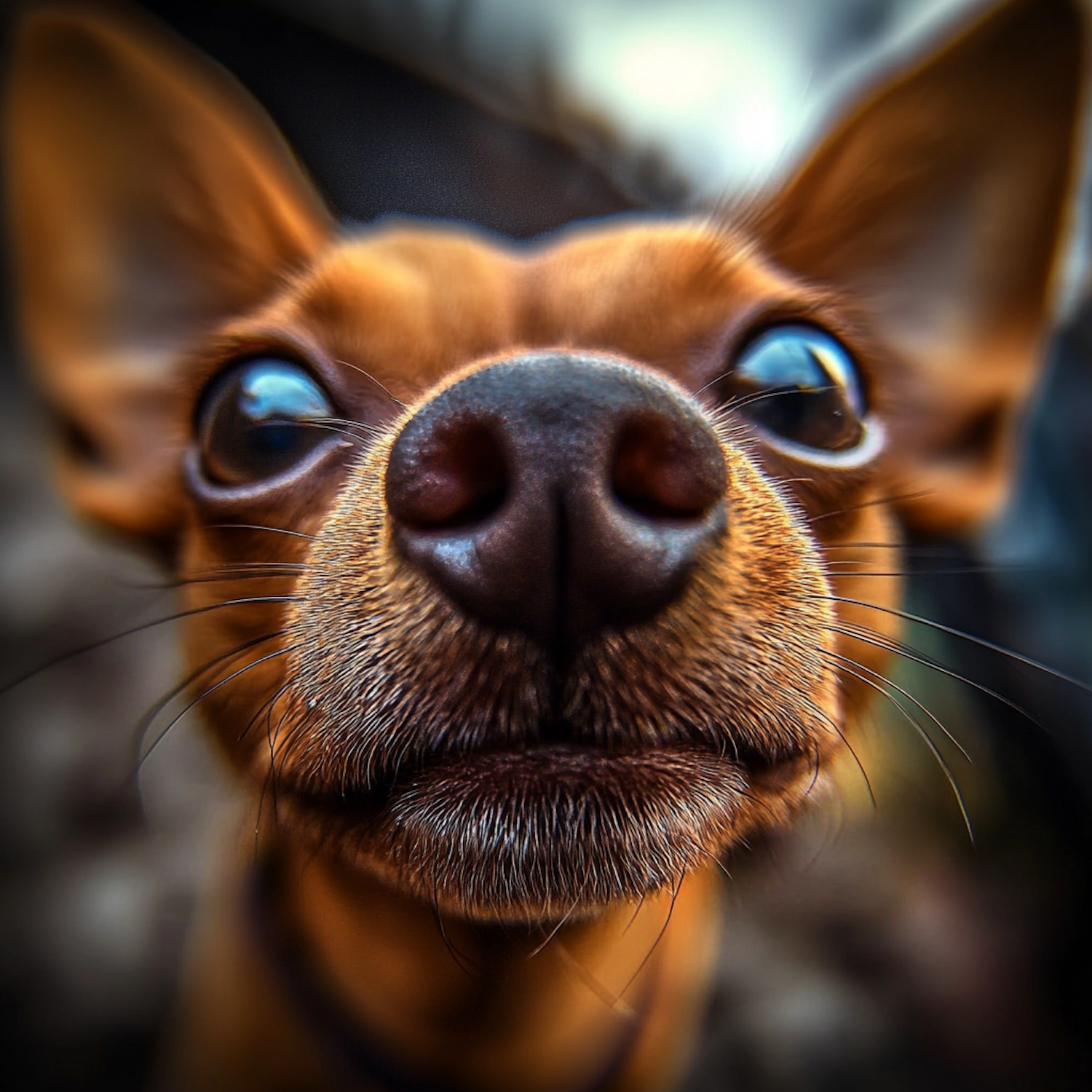 Close-up of a Chihuahua's face with a focus on its nose and eyes, creating a playful and curious expression.