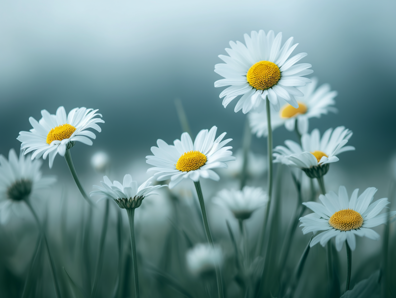 A tranquil field of daisies with white petals and yellow centers against a soft green and blue background, exuding peace and beauty.