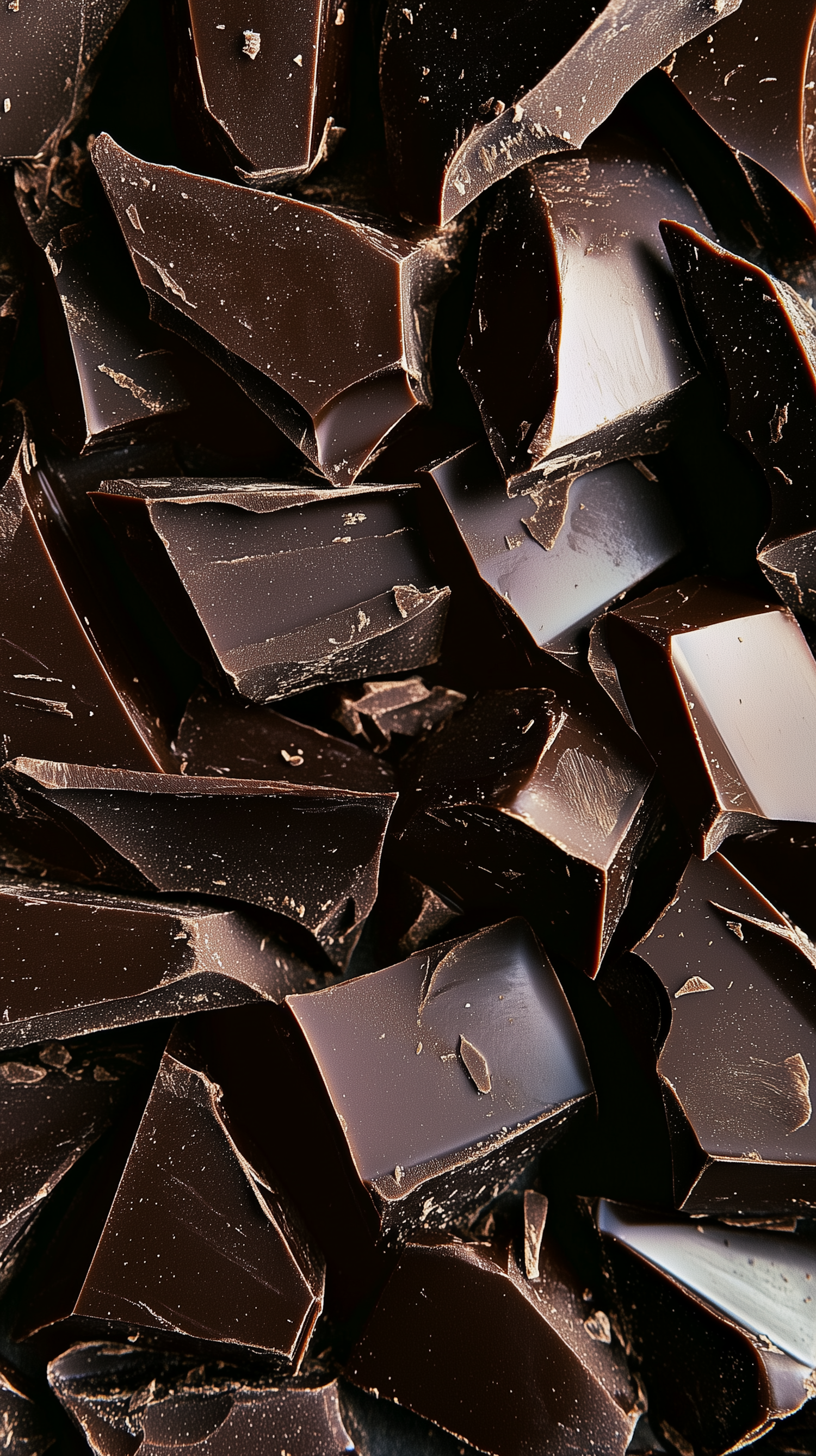 Close-up of broken dark chocolate pieces with rich brown color and glossy texture, highlighting their indulgent and luxurious appeal.