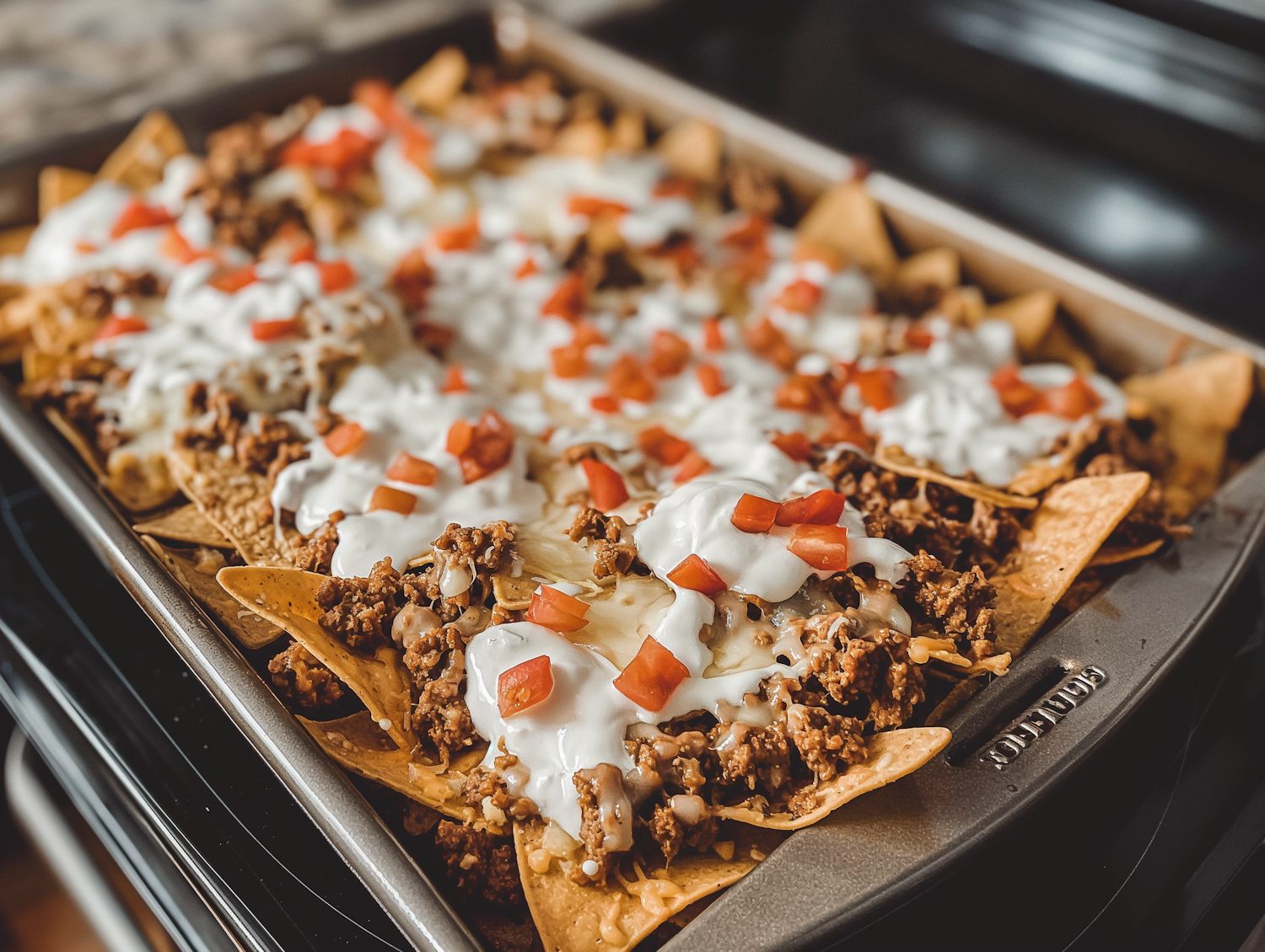 Delicious tray of nachos with ground beef, melted cheese, sour cream, and diced tomatoes, perfect for a savory snack or meal.