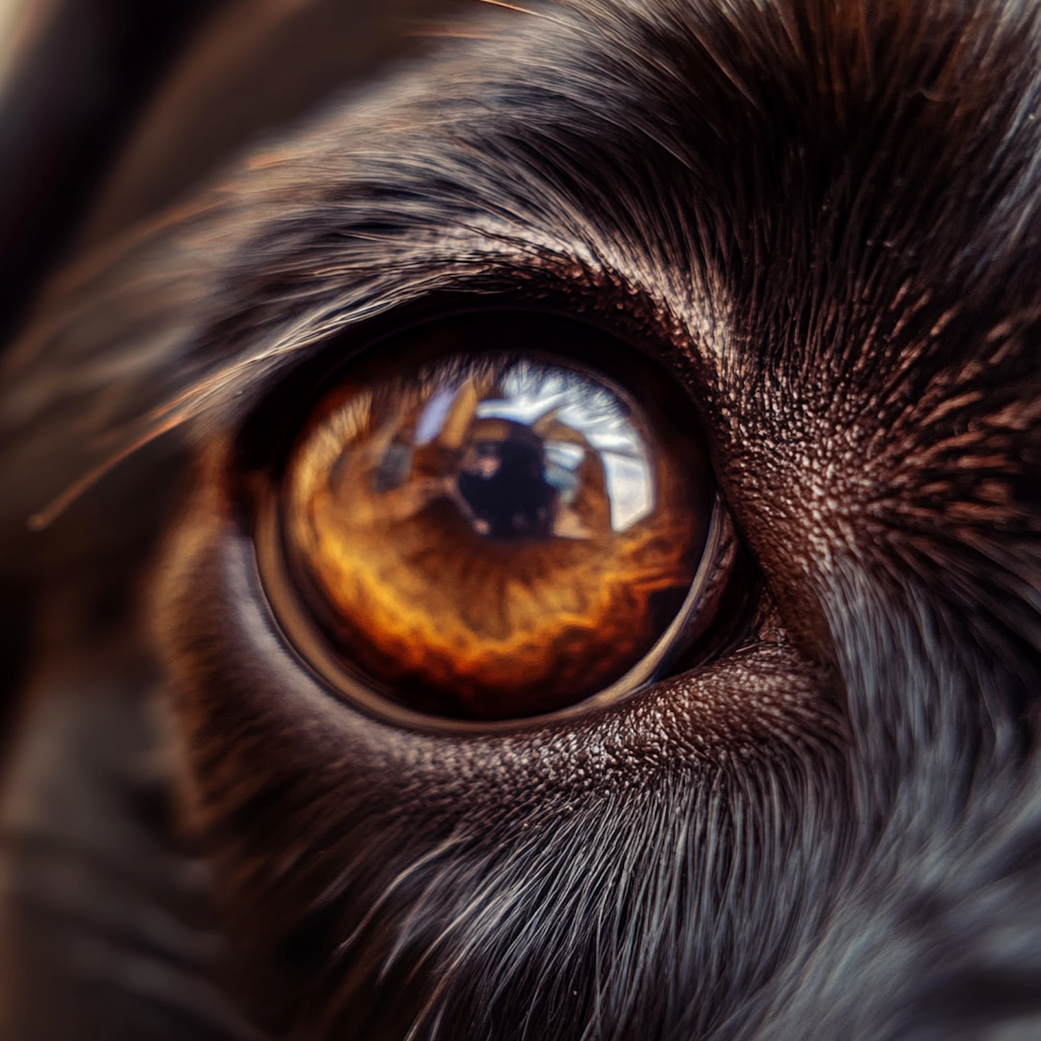 Close-up of a dog's eye with rich amber color and detailed fur texture, reflecting a person taking the photo.