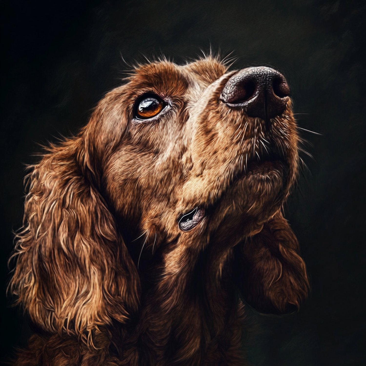Close-up portrait of a brown dog with expressive eyes and textured fur against a dark background.