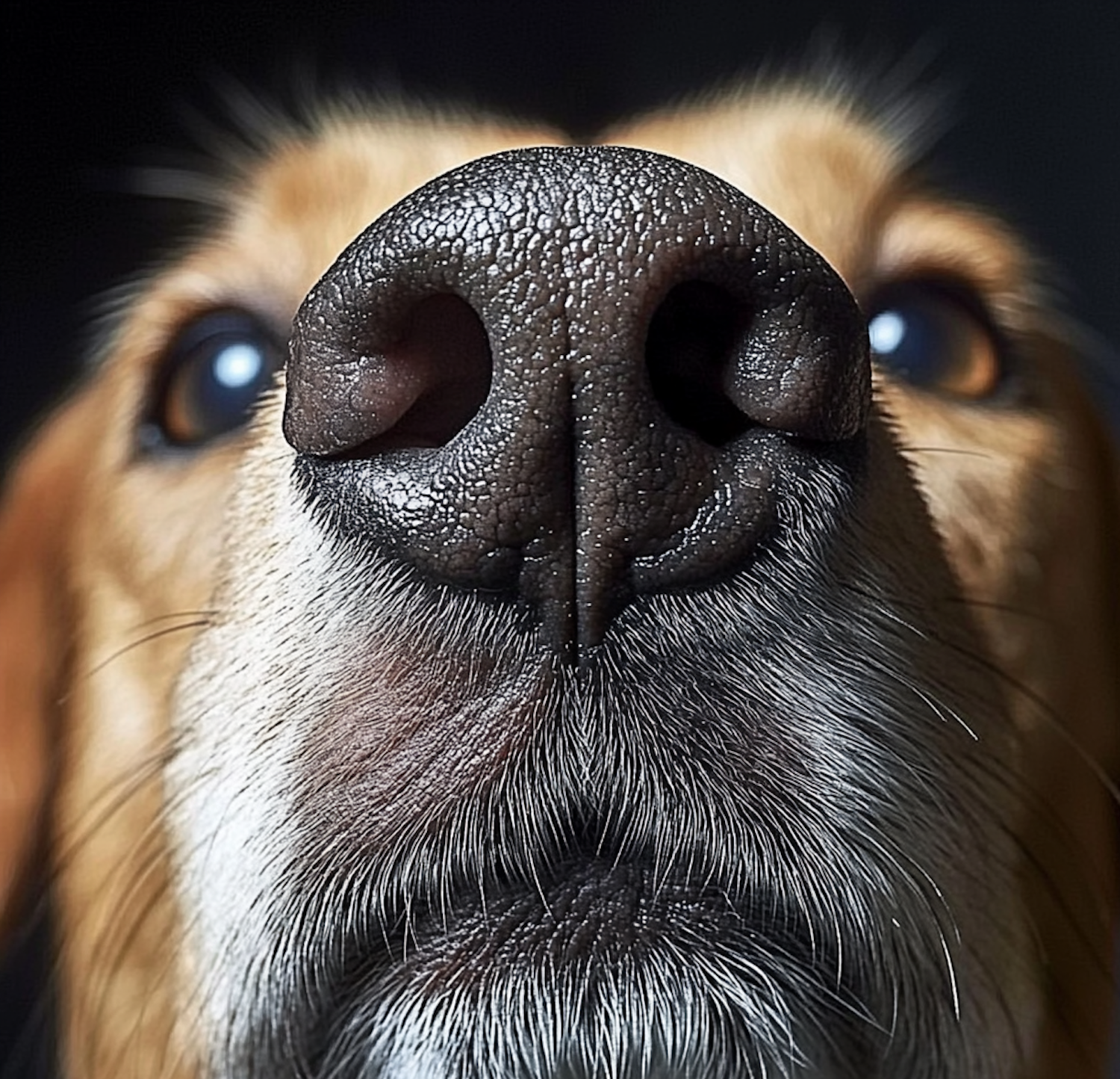 Close-up of a dog's nose with detailed texture and shiny appearance, surrounded by light brown and white fur.