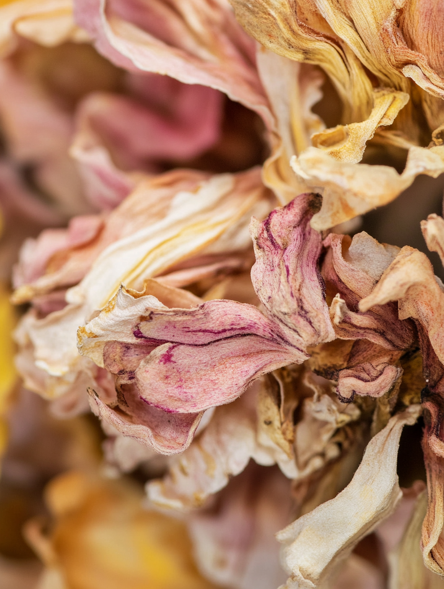 Close-up of dried flower petals in soft pink, beige, and yellow hues, showcasing intricate textures and delicate veins.