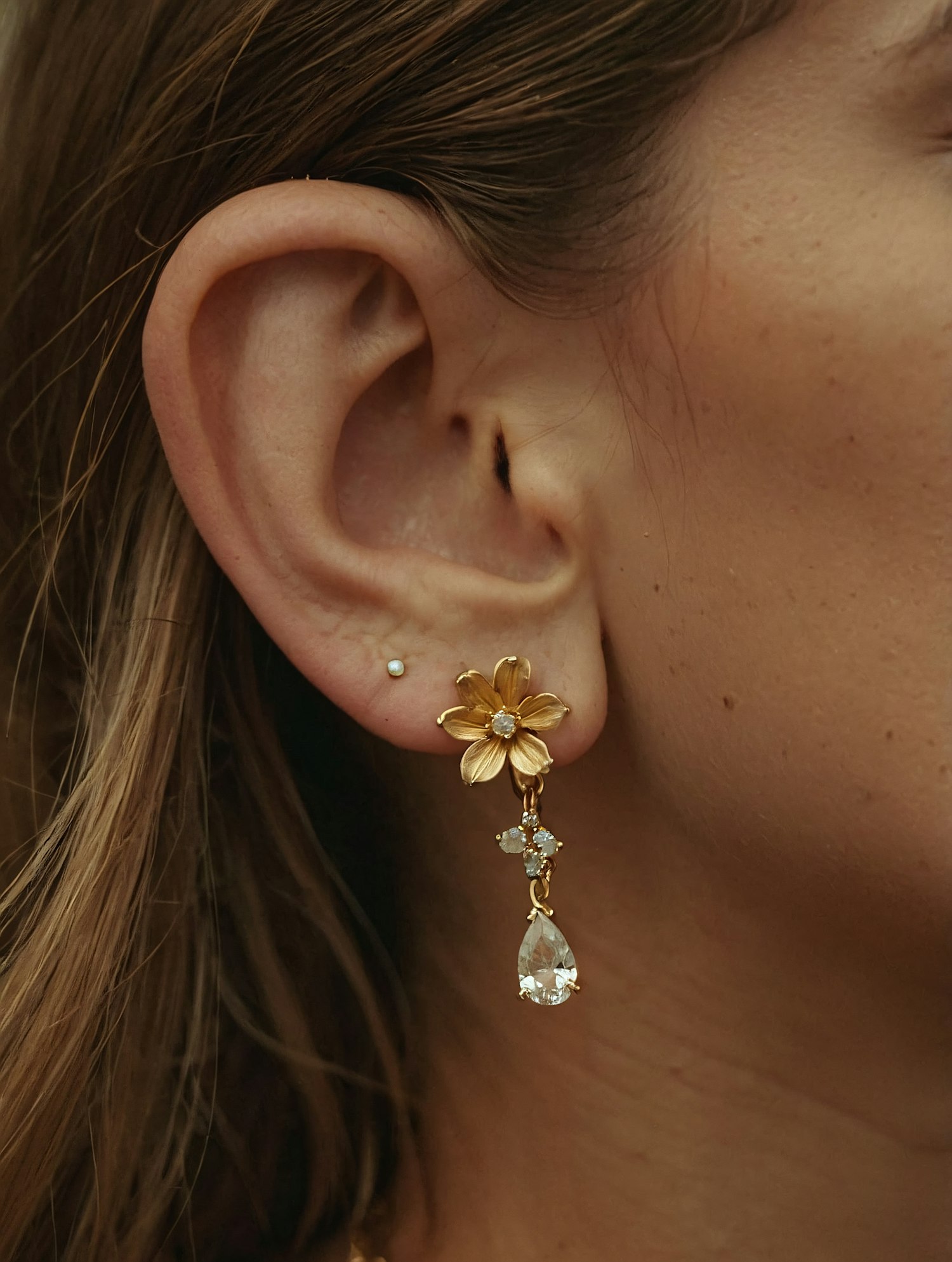 Elegant gold flower earring with teardrop crystal on a woman's ear, complemented by a small stud. Light skin and brown hair.