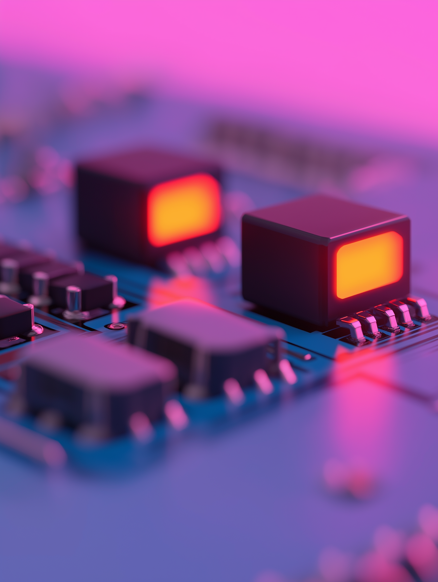 Close-up of a circuit board with glowing red components against a blue and pink background, creating a futuristic tech vibe.