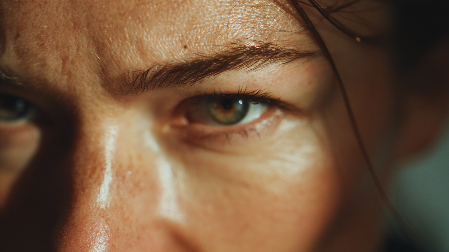 Close-up of a green eye with detailed skin texture and dramatic lighting, showcasing natural beauty and intricate facial features.