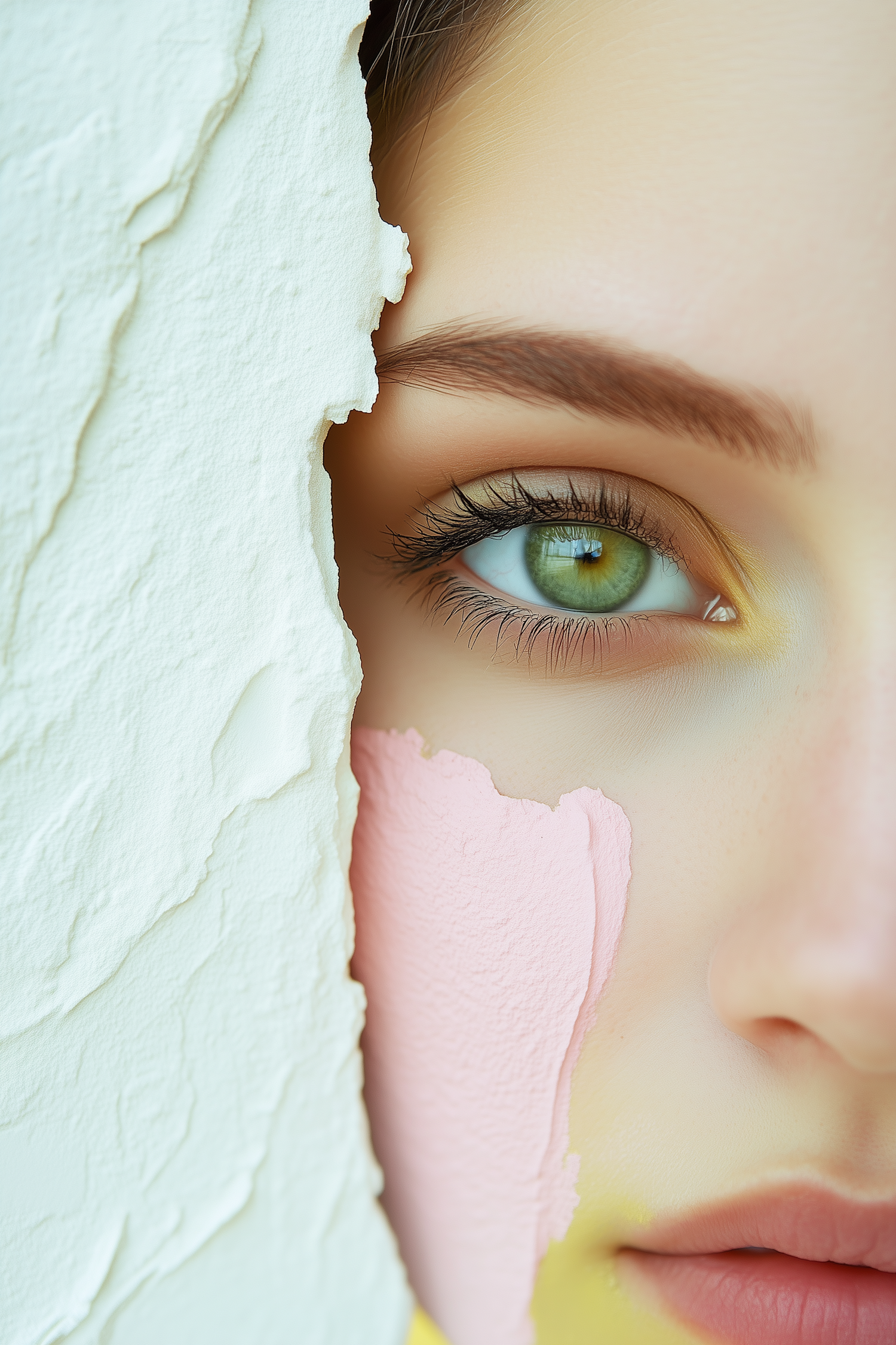 Close-up of a woman's green eye and cheek with pink makeup against a textured white background, creating an artistic contrast.